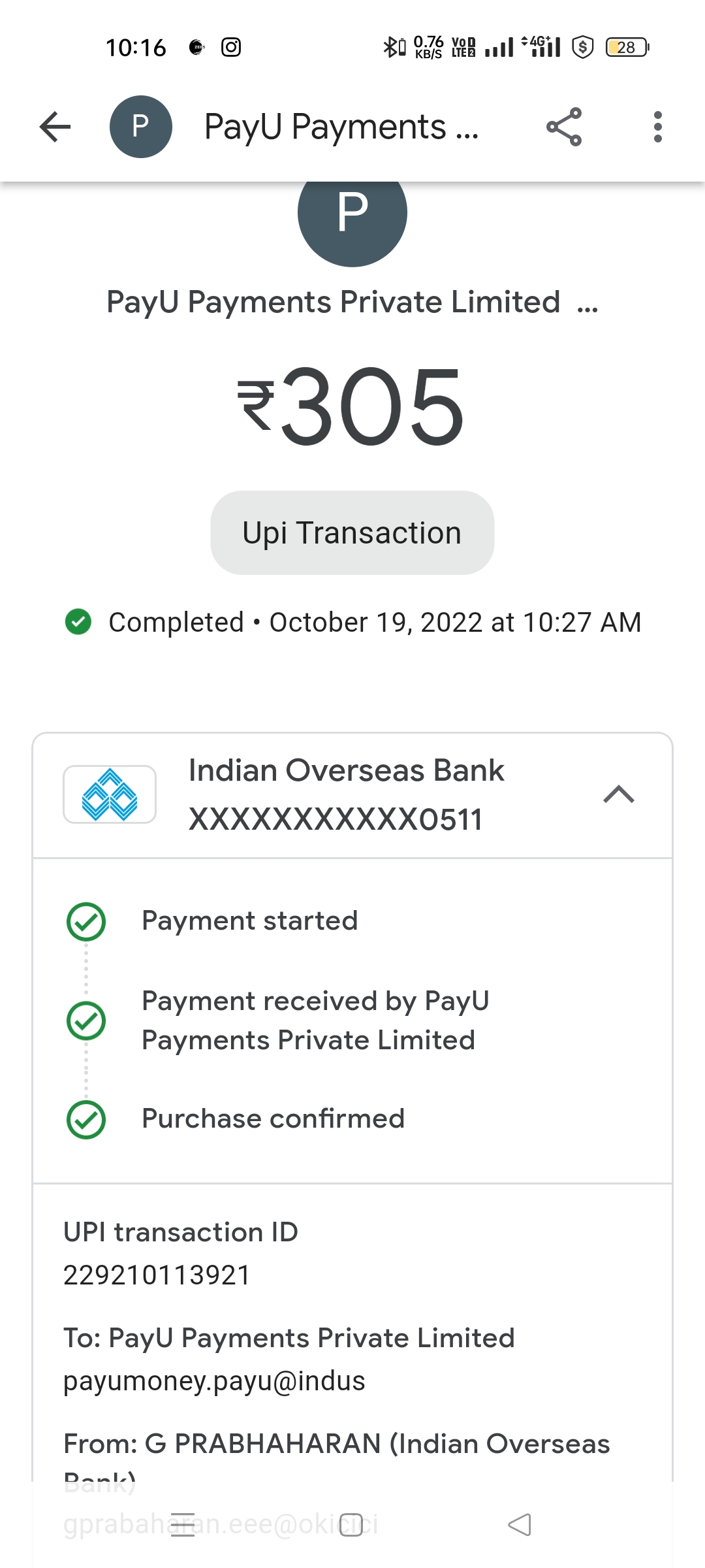 19.10.22 this date purchased but not delivered the order Pay U Payments Pvt Ltd 305 rupees paid immediately order delivered (or) Payment replacement