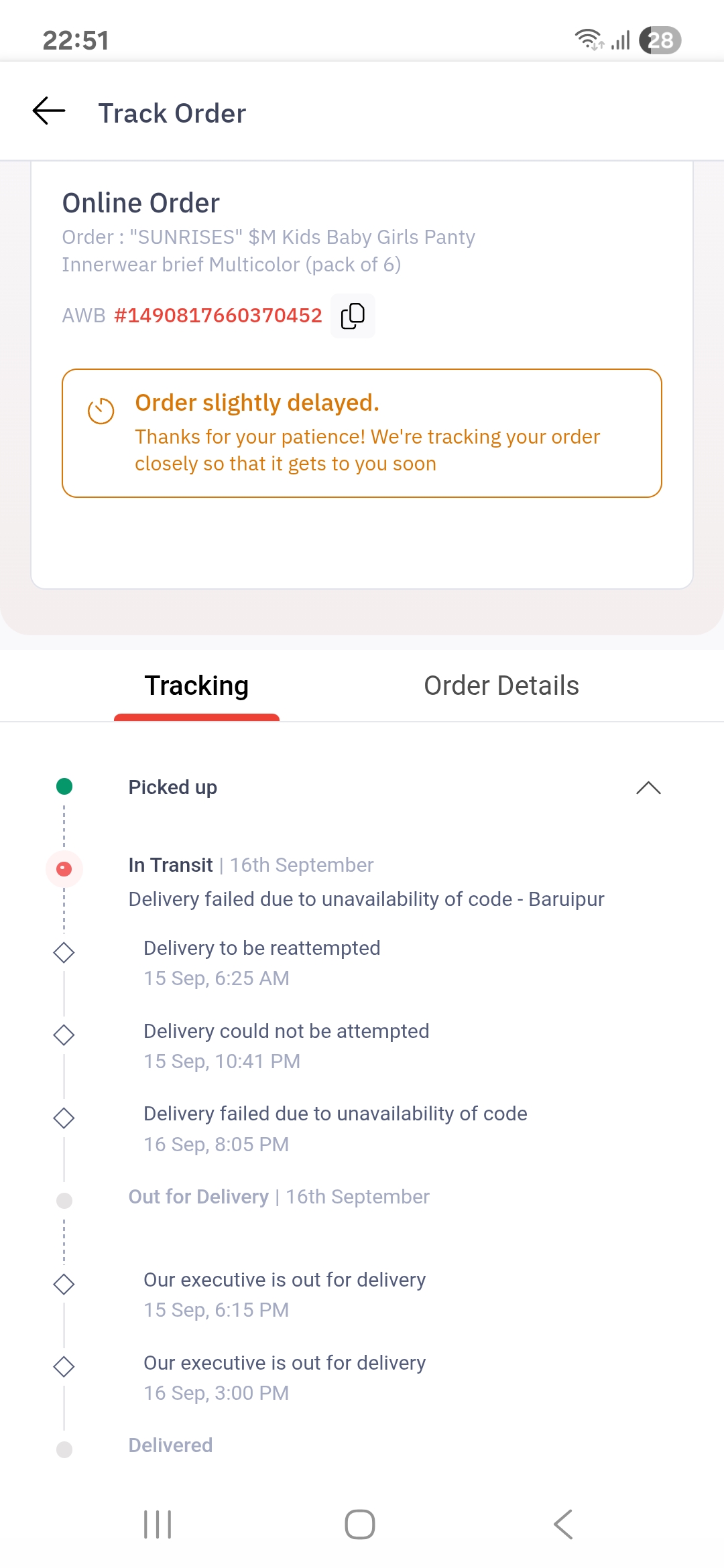 I ordered kids pants on 9th September 2025 and paid online from MEESHO app, and on 13th September 2025 my product shows out for delivery from DELHIVERY Courier Service, the delivery partner came to me but the delivery code was not received so the delivery partner left on 13th September 2025, and from 14th September 2025 to 16th September 2025 DELHIVERY courier service only shows out for delivery every day, but no delivery partner came to deliver, so I informed MEESHO and DELHIVERY courier to cancel my product and refund the money but they (Delhivery & Meesho) did not help me in any way,, so I am asking for need your help.
