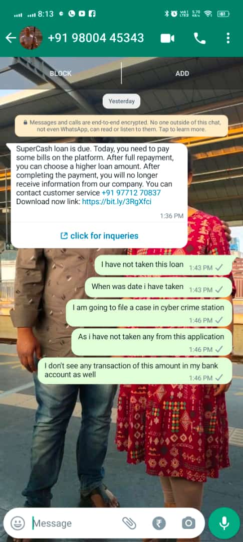 I have never taken any loan from Super cash. Now they are sending texts and whatsapp message to me and my friends. Saying i need to pay the loans. I have never taken any laons from them. After i am getting messages. When i reply that i have not taken any laon then no reply from them. When i say i will file a case in cyber police station. They are not replying.