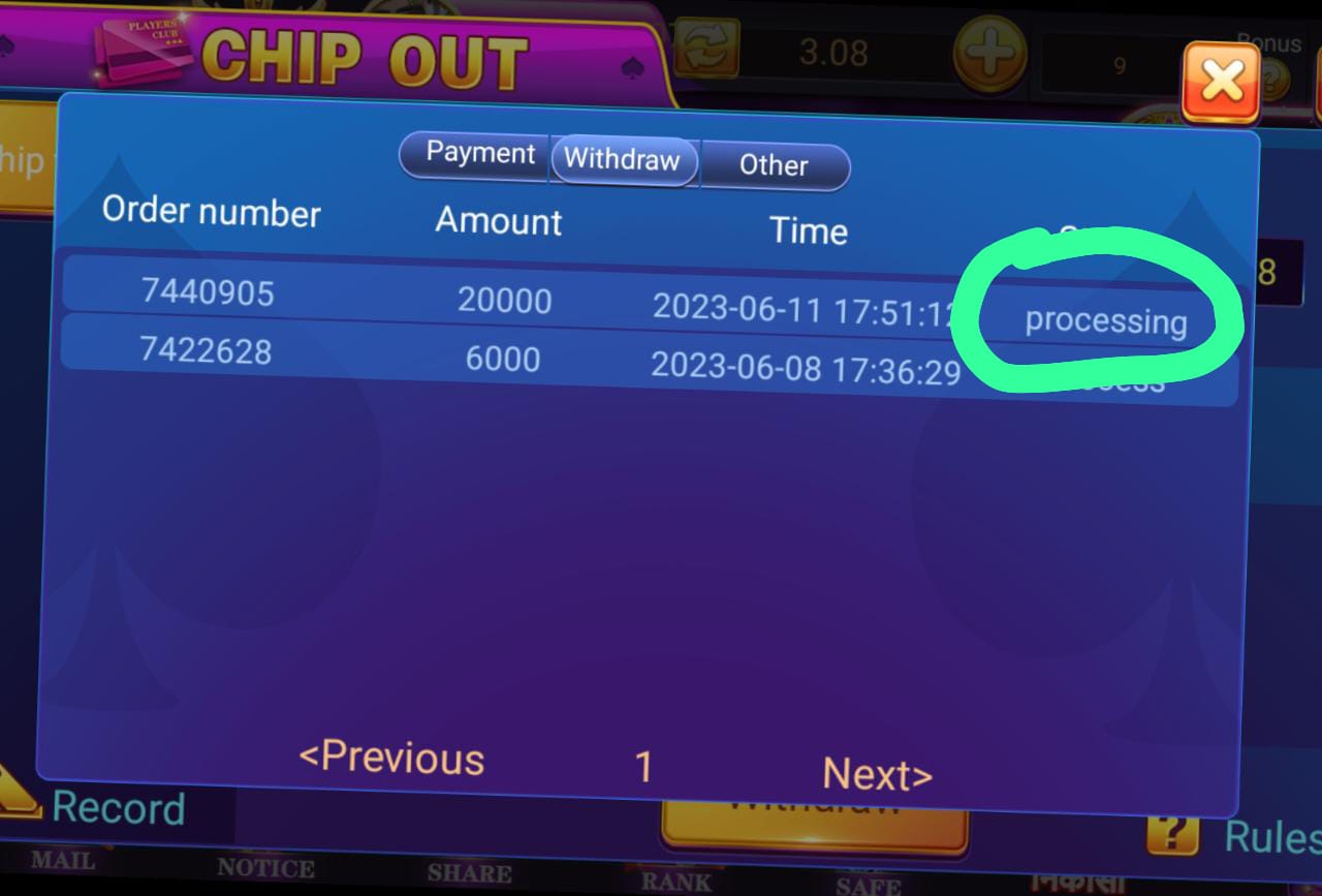 I withdraw 20000 but showing only processing before 3days to amount is not receive to my account my game 𝙸𝚍 6696332