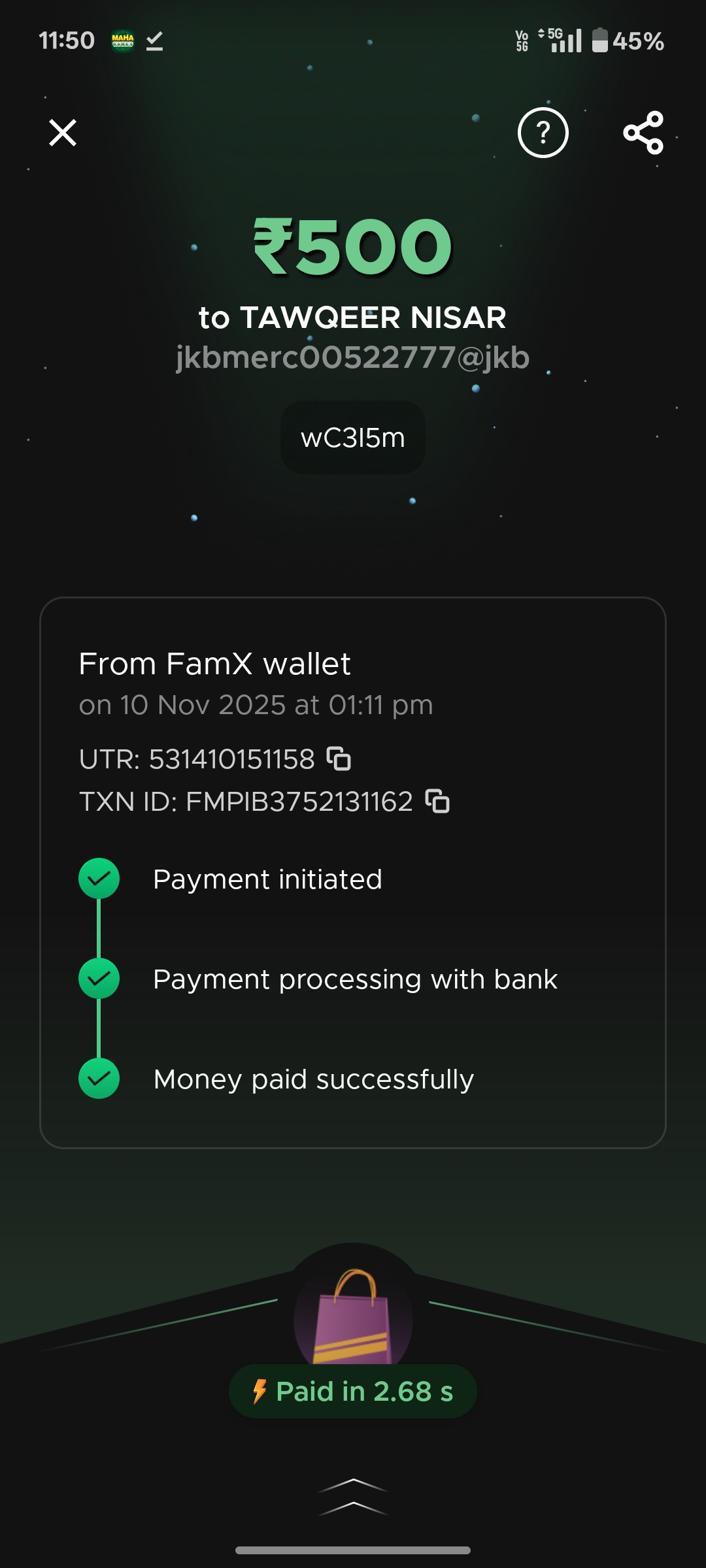 Teen patti bhani me goldan Card me recharge key hai o gema me nahi aaya hai 500 ka recharge uska UTR number 531410151158