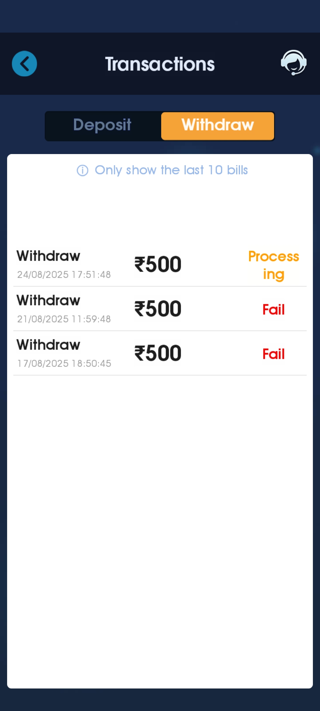 I downloaded the game from app market on 17th of August and played games.I played and won 500 rs. Then I went to withdraw option and it asked to deposit 500 rs. Minimum to start withdrawals. I added 500 rs. And then tried to withdraw my won money. It was in processing and saying that it may take 1-3 days for transaction but after 3 days the money returned back to my gaming account and transaction failed I tried again and it failed three times. It has been 10 days but the money has not been transferred to my bank account although I even deposited 500 rs in the app.
