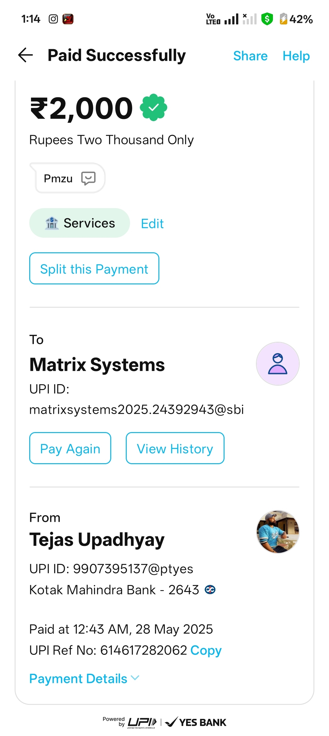 Sir ji 28 may 25 ko mene 12:43 am ko mene 2000 deposit kiya tha or uske baad sw yw log bol rahe h hum y payment recived hua inko received nahi hua to kaha gaya payment 614617282062 utr