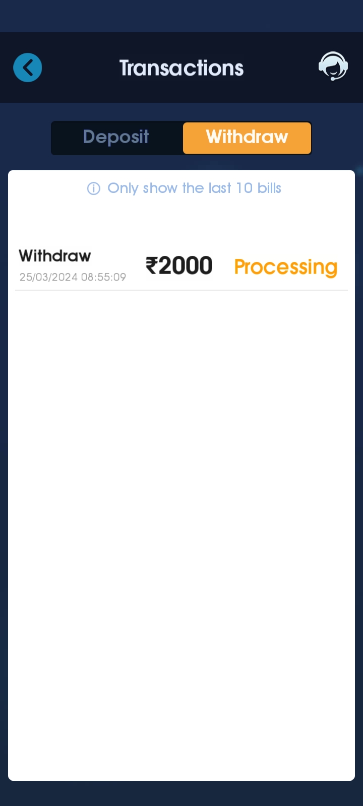 I recharge in the game 500 and my withdraw money of 2000 is under processing.. please refund my recharge amount..😭😭