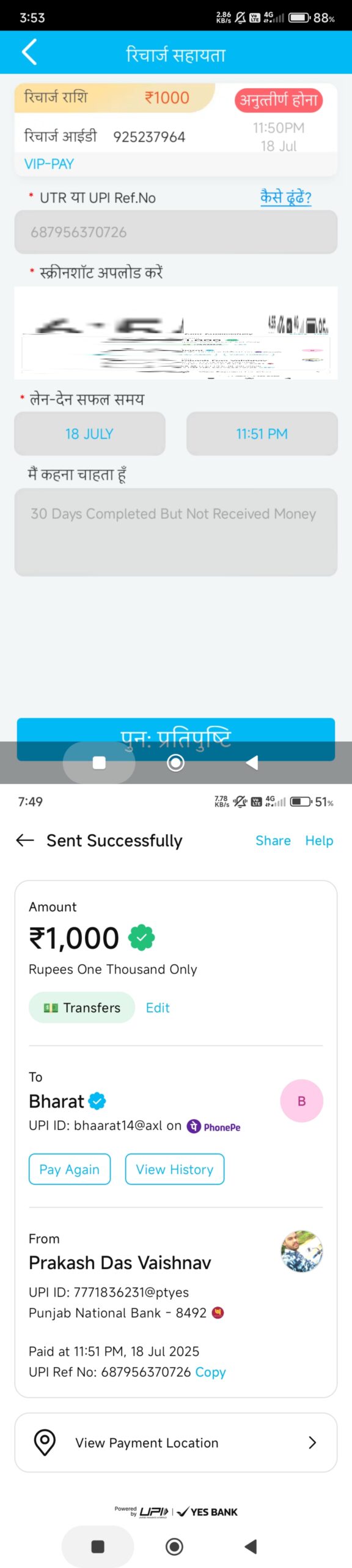 My game id is 184633986. my recharge id is 925237964 amount 1000 rs date 18 july 2025 .my recharge successfully but not received game wallet and not refund bank account please help me ЁЯШн