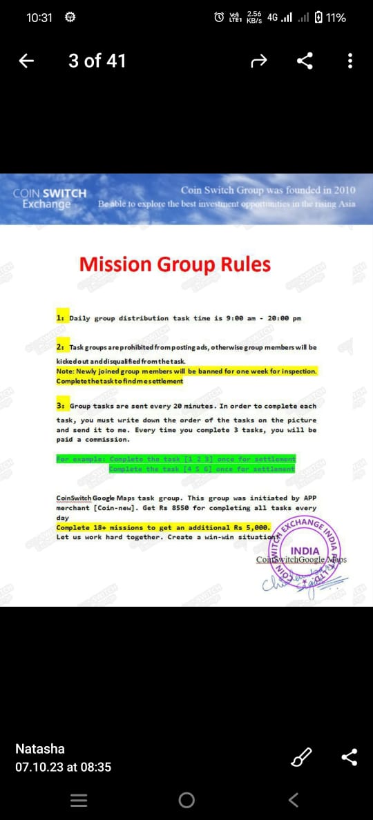 Again task is provided to select On that rahul patel chat we were 3people and he gave blame on me at evening that i choose “ETC/USDT” instead of “ETH/USDT” on https://switcate.com/#/ (My user ID is jhdjoshi93@gmail.com & UID:8555535239) which is and to correct but after this rahul is blame on me and give everone repair task again where repair plan provided by merchant is Plan 1 for 240000Rs, Plan 2 370000Rs & Plan 3 for 500000 so we confirmed for plan 1 but as i don’t have money so we all 3 take time for 08th Oct 2023. After all this i discuss with some friend & search on internet and found that COINSWITCH is totaly different ID. And then i realized the fraud.