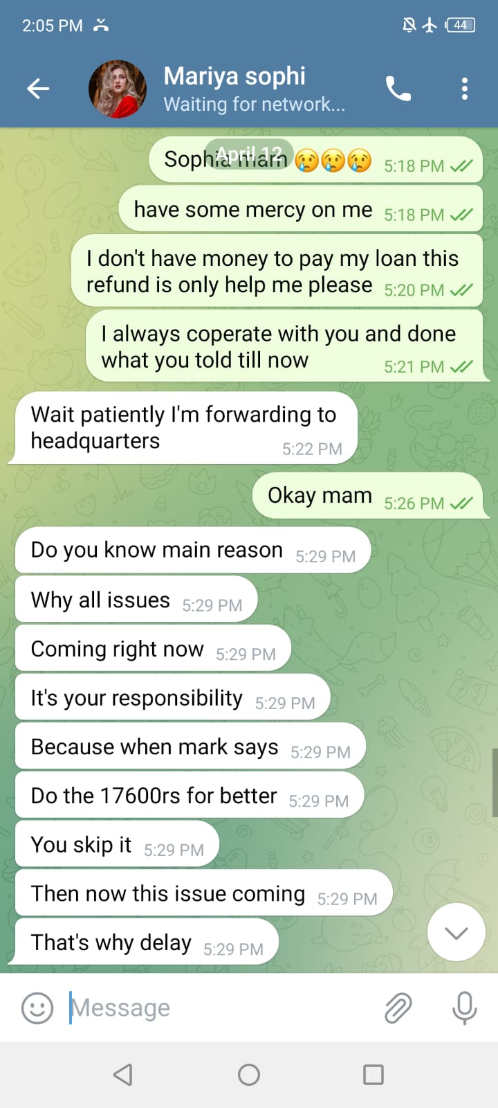 i was scammed last year from amazon task scammer after putting complaint i got a massge from this group member name of that member is mark lwin .this guy show me every proof that the people getting there refund from this group.at starting he say me that you just to pay 11k to get your amount after i pay this amount he givbing me username link of her managar name-MARIYA SOPHIA-LINK(@Paymentapporve) she told me to buy the a golden ticket becaouse your amount is big to withdraw .she make me to buy ticket of 45k till now in diffrent diffrent charges i pay 2.5 lac and at the end they told its a bank fault that you not get your money .. i told them to pay my refund and they say me to pay the refund charges … i have payed a refund charges of my 2.5lac rupees i have a every screen shot from start to end conservacation .. mark lwin shared a refund charges proof with username link.. they all user told me that they didnt get any refund from this group