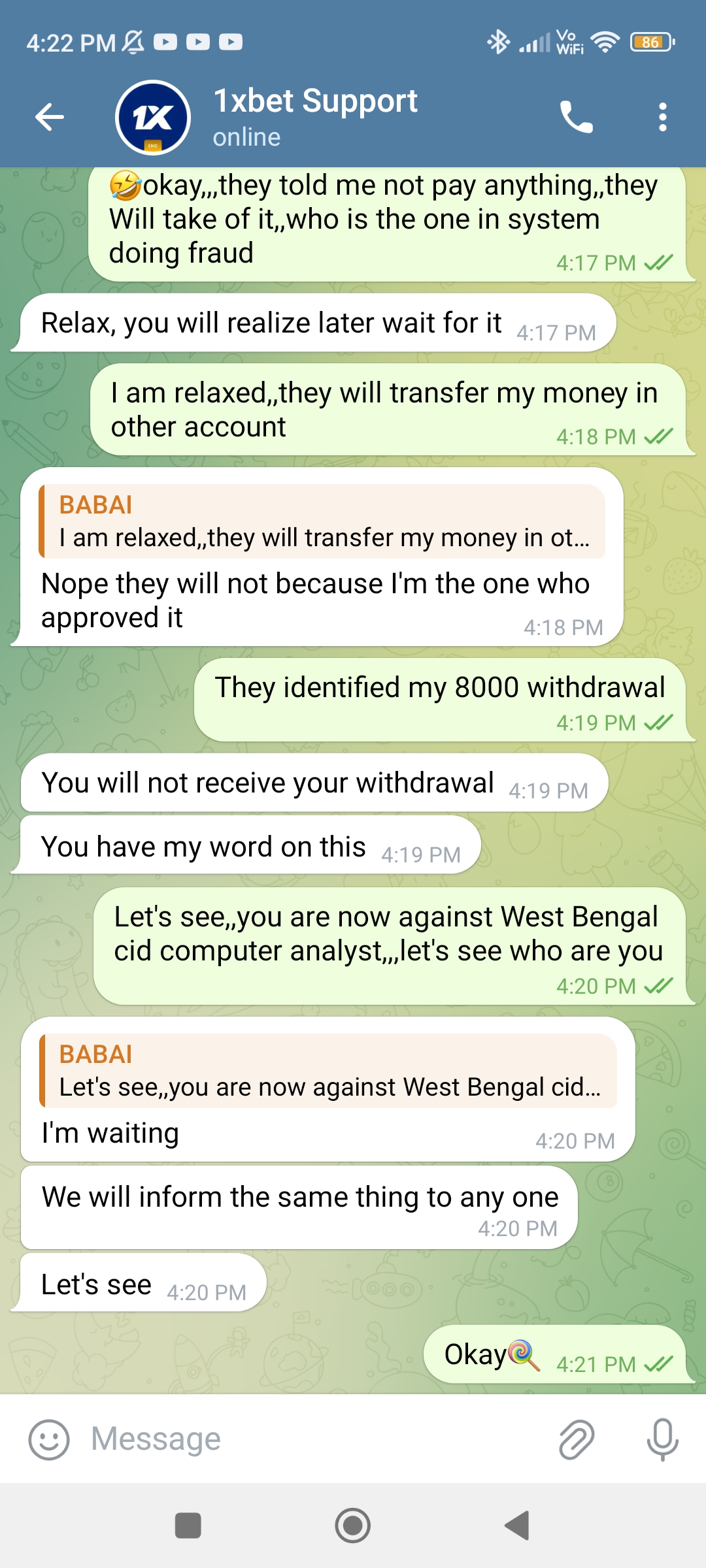 He told me that to process my ₹8,000 withdrawal, I must first send ₹5,000, or my account would be blocked. I refused to pay. Later, I found that my 1xBet account had been blocked.