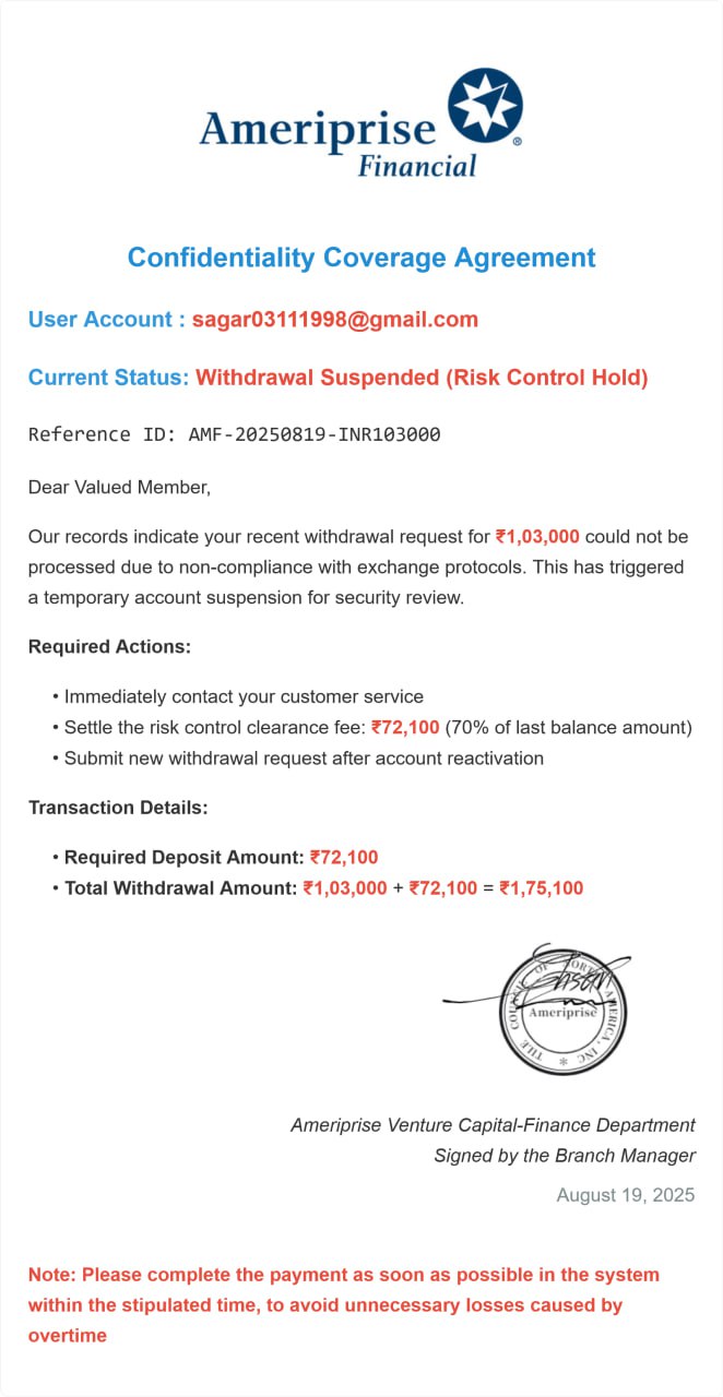 First they ask me to invest 17000 then they show me profit then again ask to to invest 49000 in case of taking out money and ask to withdraw the amount after the first withdrawal they freeze the wallet hai and then again asking money to deposit to withdraw the my amount