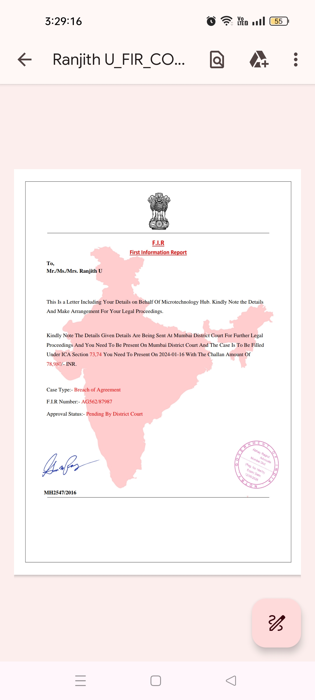 A person from a company named Micro Technology hub contacted me for data entry jobs and that it would pay 24000 rs and they will take 5800 rs for the registration amount. They sent an agreement which had my photo and my name on paper which they asked as part of verification. The agreement was not mentioned before, they kept my photo and name without telling me. They sent a link to login and fill the forms. Then I started to complete my work in between sometimes the web page getting refreshed and some of forms I completed they are mentioning it properly. And now the task is not completed and time they assigned is also not proper and now they are threatening that I have to come Mumbai district court for hearing or I have to pay 5800 registration fee of the company. I am very depressed by that, so please help me out of this. Kindly guide me what to do next. I am from Bangalore and that is not possible for me to come to Mumbai district court and they are forcing me.