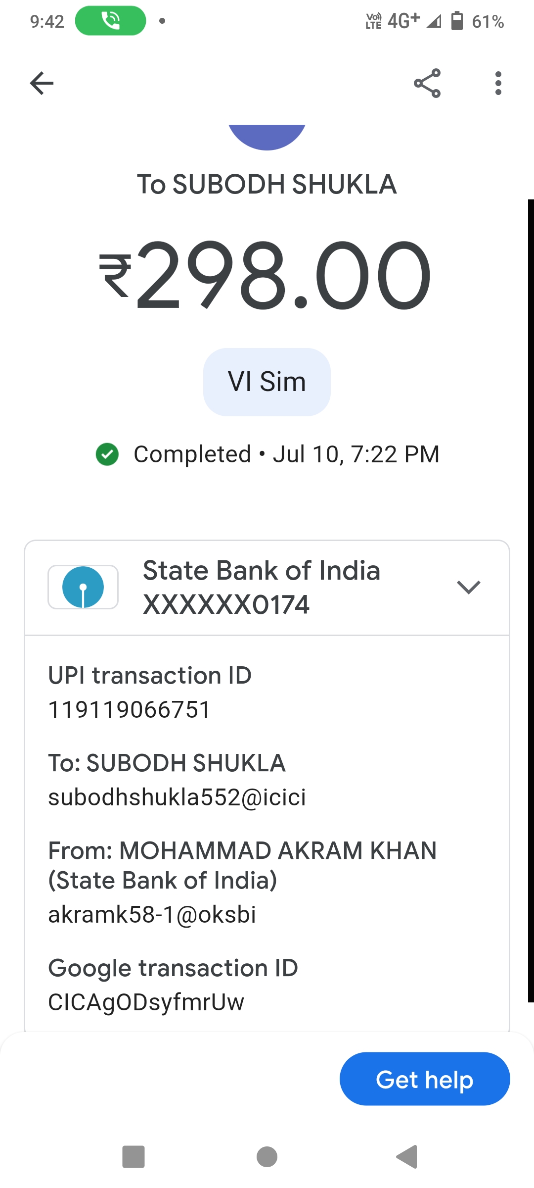 I booked a VI postpaid sim through online and 1 guy came to my place and he delivered my sim to me and he asked that I have to pay 298 rs. For advance which this amount will be adjusted on your 1st bill.. so I paid him through upi. but it’s not happened so I called him that my bill has not been adjust please do the needful so he said that he will check and since I called so many time he is not picking my phone. So I called a customer care and explain everything so they raised a complaint but it’s been 7 days and my problem is not solved.