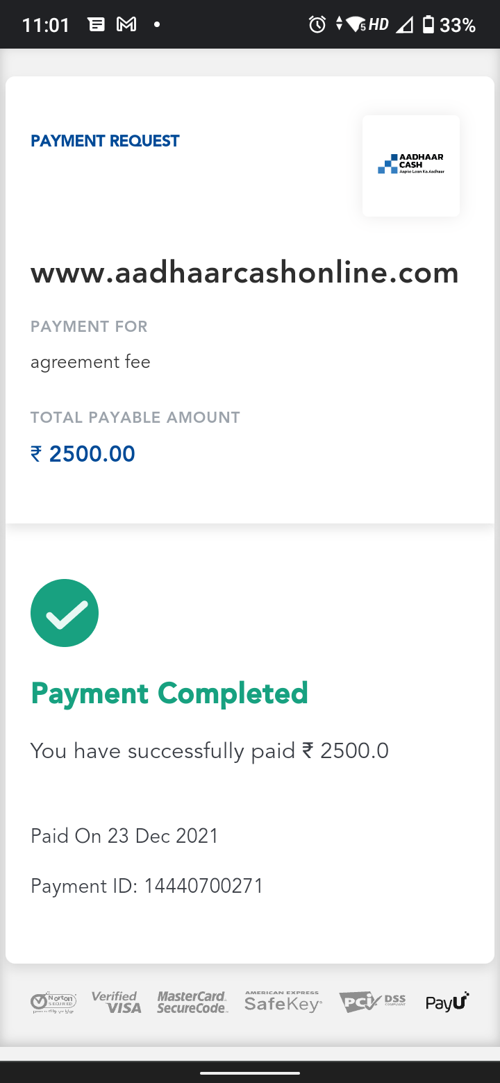 I need money so I search website loan I get link Aadhaar cash. So I submitted require documents and I paid 449 rupees money on date 23/12/2021. And next I received message Congratulation!!! Hi, Name your Loan has been approved, please submit Loan agreement fee.then I pay ₹2500 Take a loan by getting it done.then one more msg for (Hi, Rohit Bora please submit Loan file charge, Ref.no.ACF8547497, to file your loan after that you will get a loan. hurry up! Link https://pmny.in/eI0KlzTLcVkM Team Aadhaar Cash)