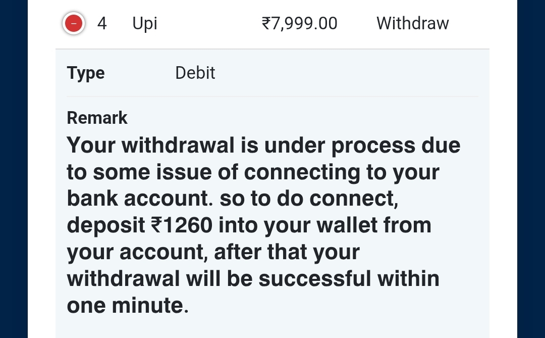 This website is fraud and virtual site of lotus 365 . I made an big mistake, first I deposited 450rs in wallet and then I makes money and gone for withdrawal This site Says to pay 810rs for onetime withdrawal. I payed, then I filled all details of bank. In the end withdrawal request send successfully but when I go in transaction history there was written, pay 1260rs to connect to your account, I payed but 1260rs did not received in my wallet and money was deducted already ðŸ˜