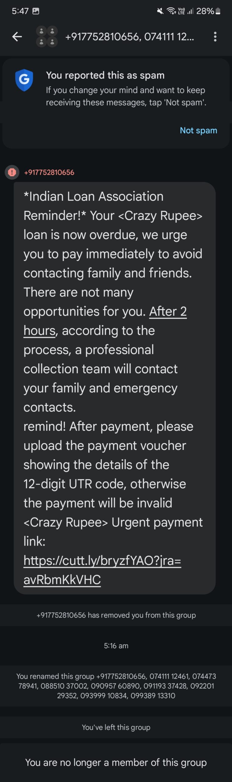I got a message from unknown number saying-*Indian Loan Association Reminder!* Your loan is now overdue, we urge you to pay immediately to avoid contacting family and friends. There are not many opportunities for you. After 2 hours, according to the process, a professional collection team will contact your family and emergency contacts.