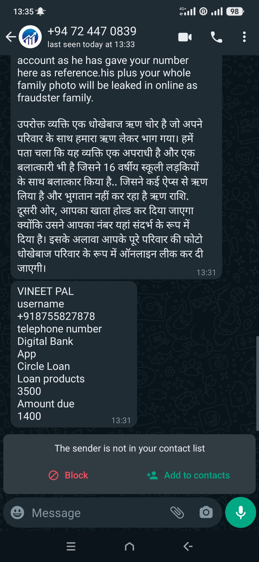 I have got this WhatsApp message and was trying to defame one of my known person and they were trying to threathing. I am strongly condemned like this illegal activities.