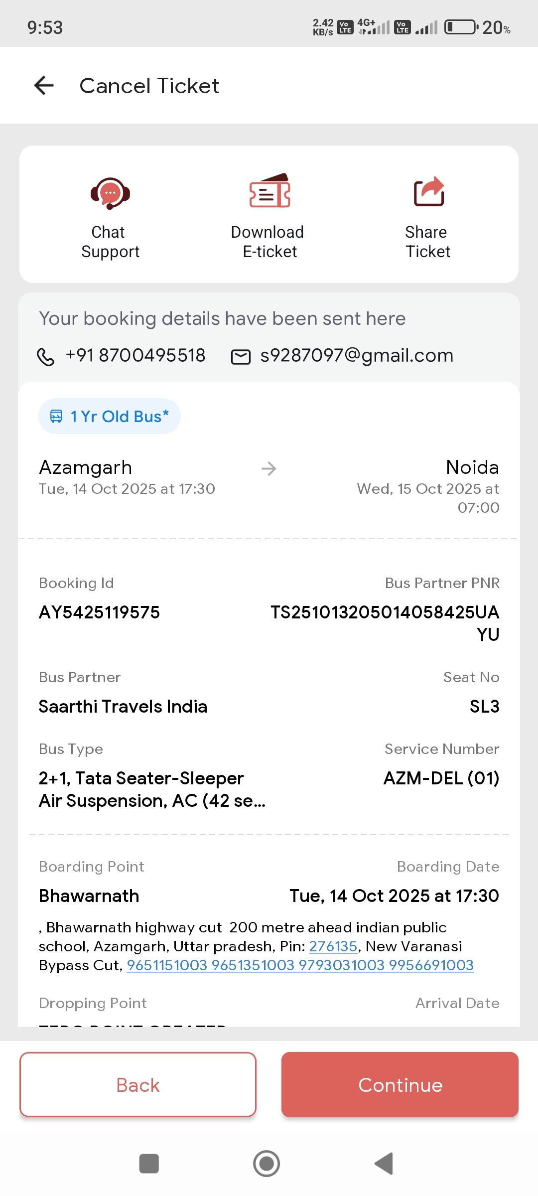 I am booking ticket date-13/10/2025 saarthi bus travel india by Abhi bus app this company saarthi bus travel india not responding my complain for service I book ticket wrong distance by mistake I request to change my destination but not responding my request journey date – 14/10/2025 traveller name -anita seat no – SL3