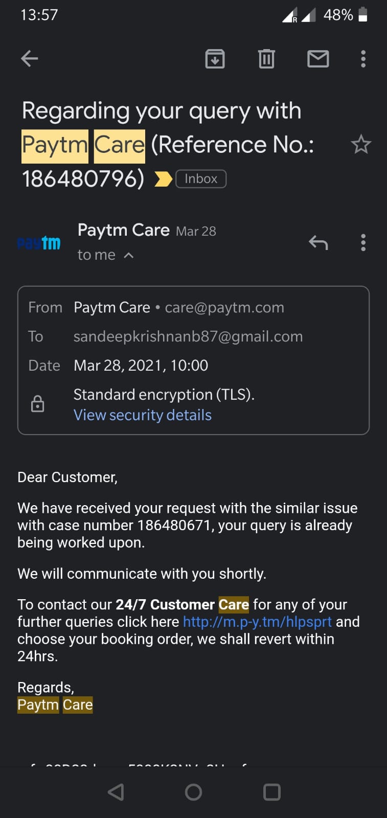 However I also place on record that I have never faced this kind of issue with Paytm till now and I’m fully satisfied with services of Paytm till now baring this incident.