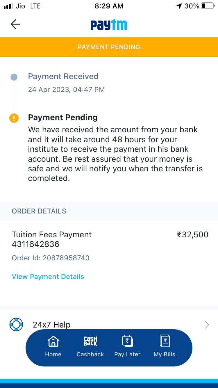 I Rohit registered Mobile No. 8930687374, recently I transfer the tuition fee to the institute but still now not reflected in the beneficiary account. 2 days have been completed but the fee is not reflected in the beneficiary account.