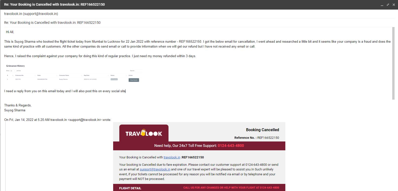 I tried booking the ticket from Travolook after deduction of my money from bank Rs. 5253 later within 30 mins I see that they sent me cancellation ticket which is attached. After this incident I researched about this company and found they are fraudster and don’t refund the money to anyone till the time we raise complaint against them. All the other companies do send email or call to provide information when we will get our refund but they nor send me email or call me.