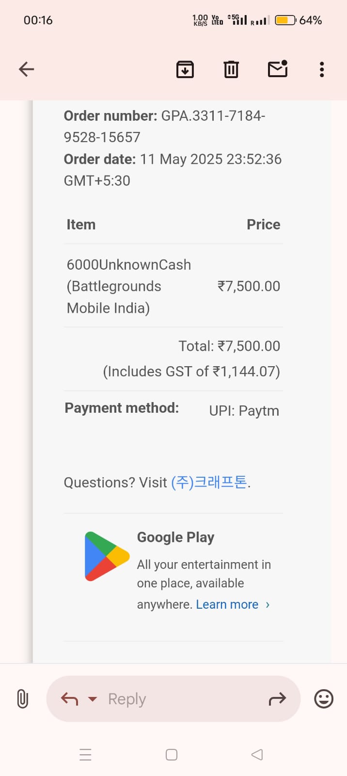 I purchased BGMI UC from playstore payment deduction but UC not recived yet. Payment done 7500₹