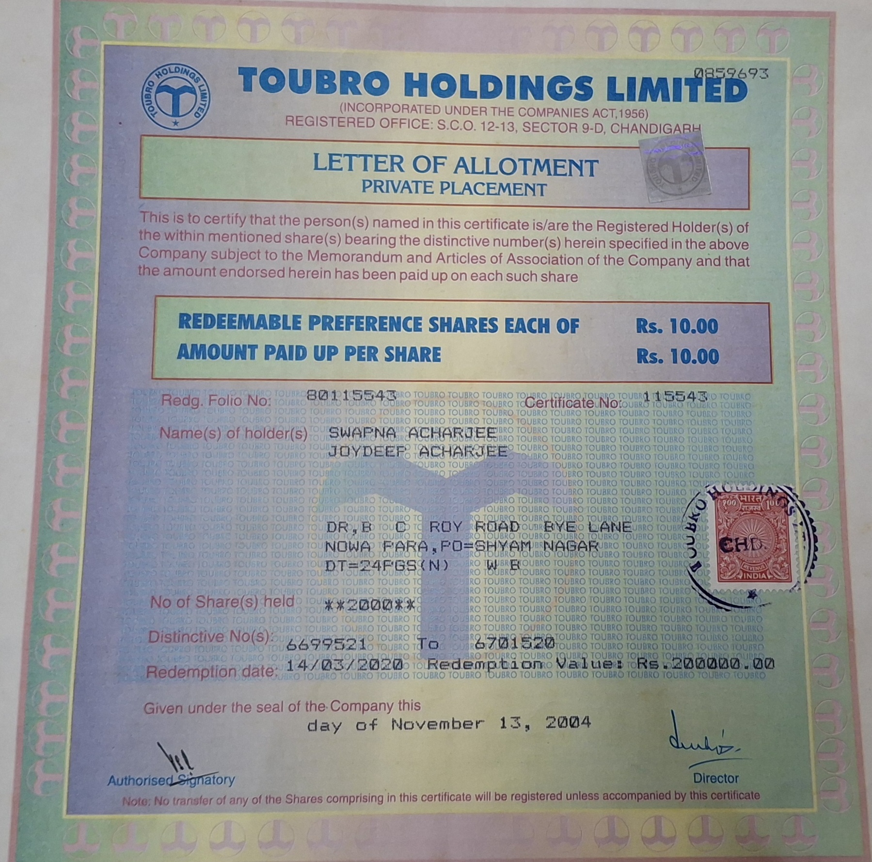 Myself Swapna Acharjee had bought total 2000 shares worth of INR 20000/- of Toubro Holdings Limited on 13.11.2004. The certificate is attached herewith. It has already matured on 14.03.2020 and I shoud get an amount of 200000/- . But I am unable to submit any claim to get refund due to lack of information.