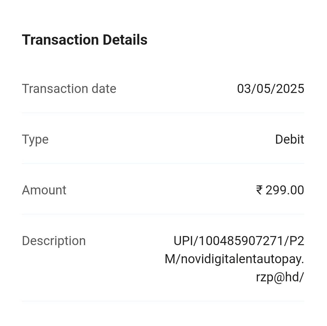 I, Kartik, am filing this complaint to report an unauthorized deduction of ₹299 from my Punjab National Bank account on 03/05/2025. The transaction was labeled under “Novi Digi Talent Autopay”, a service I have never subscribed to or interacted with in any form. I did not authorize any autopay, purchase, or registration related to this entity, nor was I informed or invoiced for any such payment. This deduction was made without my knowledge or consent, indicating a serious issue of unauthorized transaction and potential fraud.