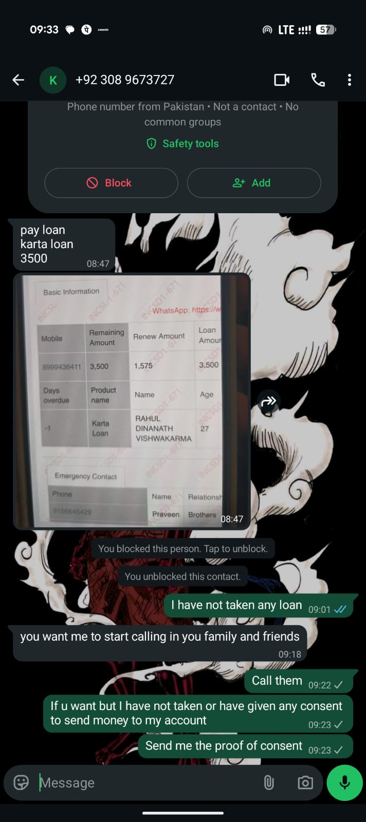 I have a retail Shop in which i receive daily multiple online transactions, on 12-03-2026 i received Rs.2100/- three times from different users individually but after confirming from my customers they didnt sent that amount to me. After 5 days i.e. 17-03-2026 i receive a whatsapp message from some random number on that u have to pay this 3500/- as u have taken loan from us , which i dont have the slightlest clue of , kindly look into this matter as it is a FRAUD. IF THEY WANT I CAN SEND THAT AMOUNT BACK WHICH THEY HAVE SENT ME BUT NOT 3500/-