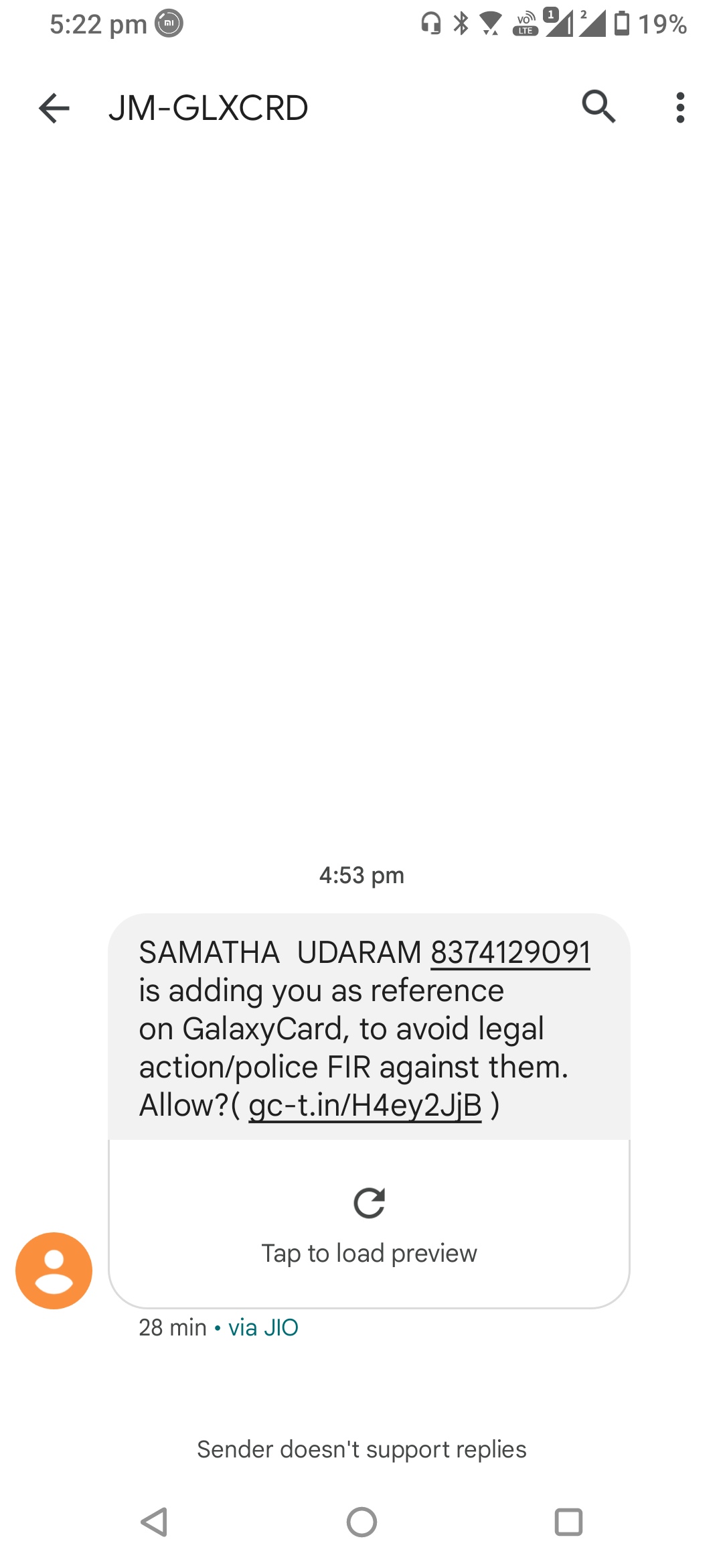 Got a message saying that I’m added as GalaxyCard reference for someone and to avoid legal action/FIR to be raised against them. I don’t know the person, I didn’t authorize any such thing.
