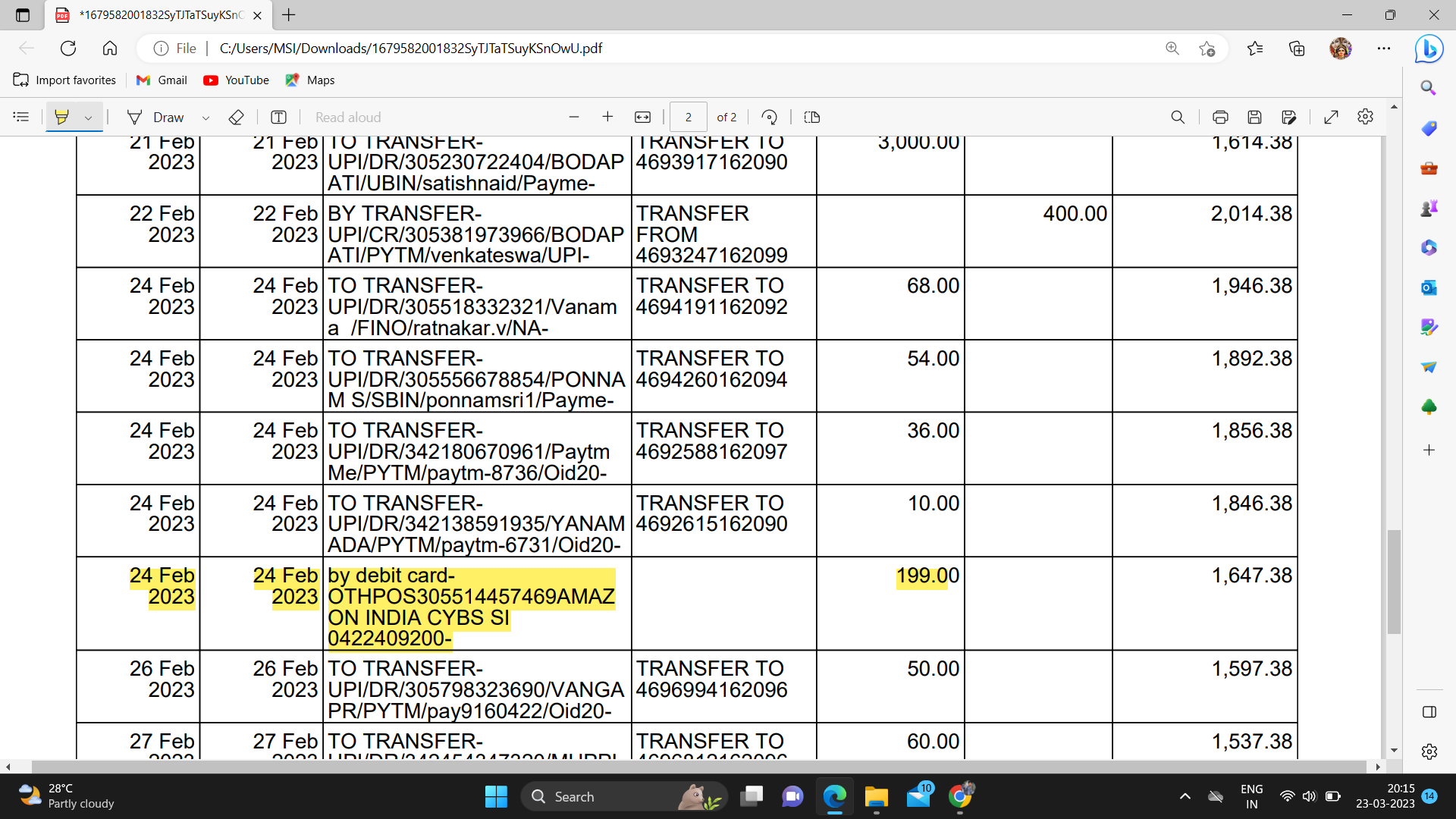 Rs.199.00 has been spent via my Debit Card at AMAZON INDIA CYBS SI0422409200- on Feb 24 2023 7:56PM without any PIN/OTP.
