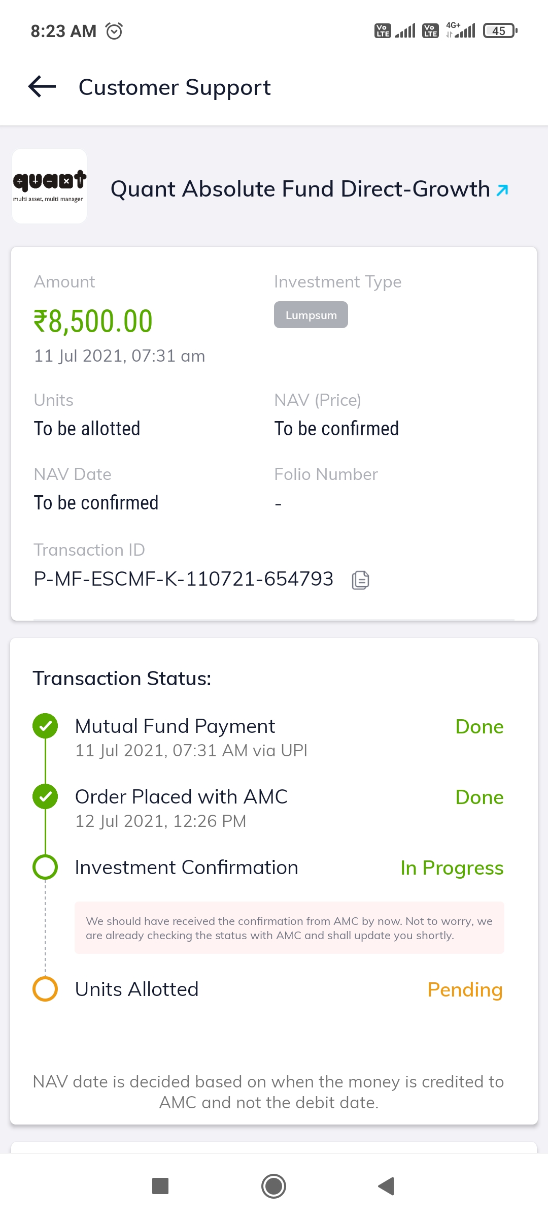 I have invested 8500 rupees in Quant Absolute Fund Direct Growth through paytm money app with transaction id no – P-MF-ESCMF-K-110721-654793. On 11 July 2021 and order placed with AMC on 12 July 2021. But neither units have been alloted nor payment confirmation has been made by AmC till date.