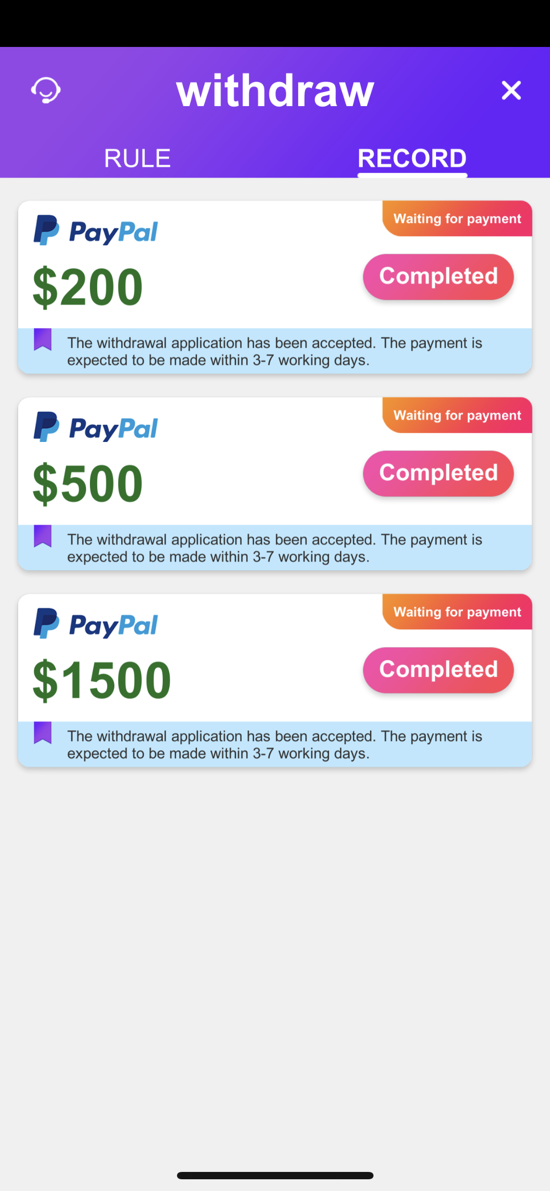 Watch ad after ad and received no payment, still saying payment will be received in 3-7 days