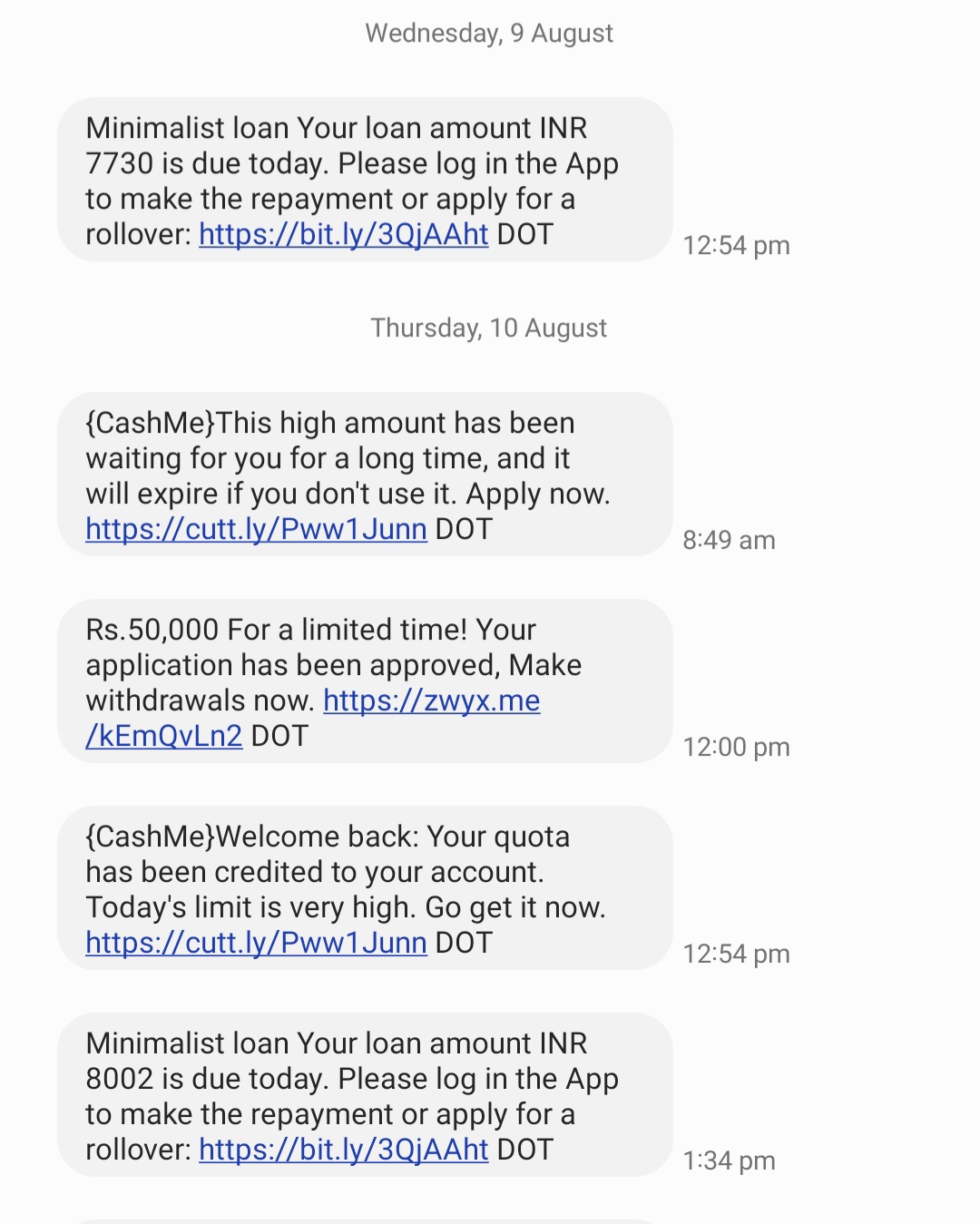 Sir I have not taken any loan from minimalist loan but they are forwarding messages again and again to pay. I am fed up about it. I am a heart patient. Kindly look into the matter and take strict action against them.