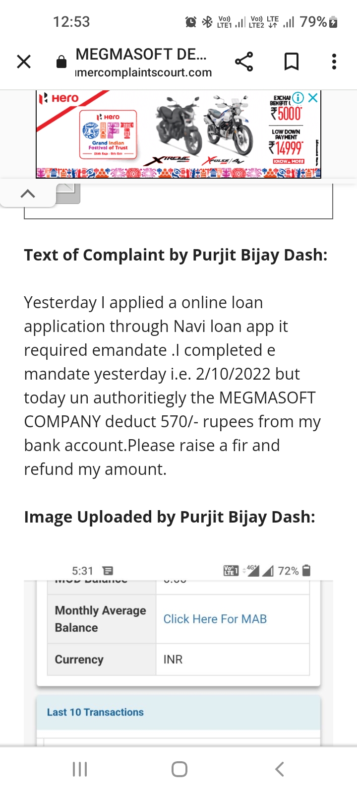 Megmaso company has taken twice time money from my account on 1/10/2022 and 04/10/2022 570 rs twice without my consent. Kindly help me to get my money back also I want to complain against this fraud company