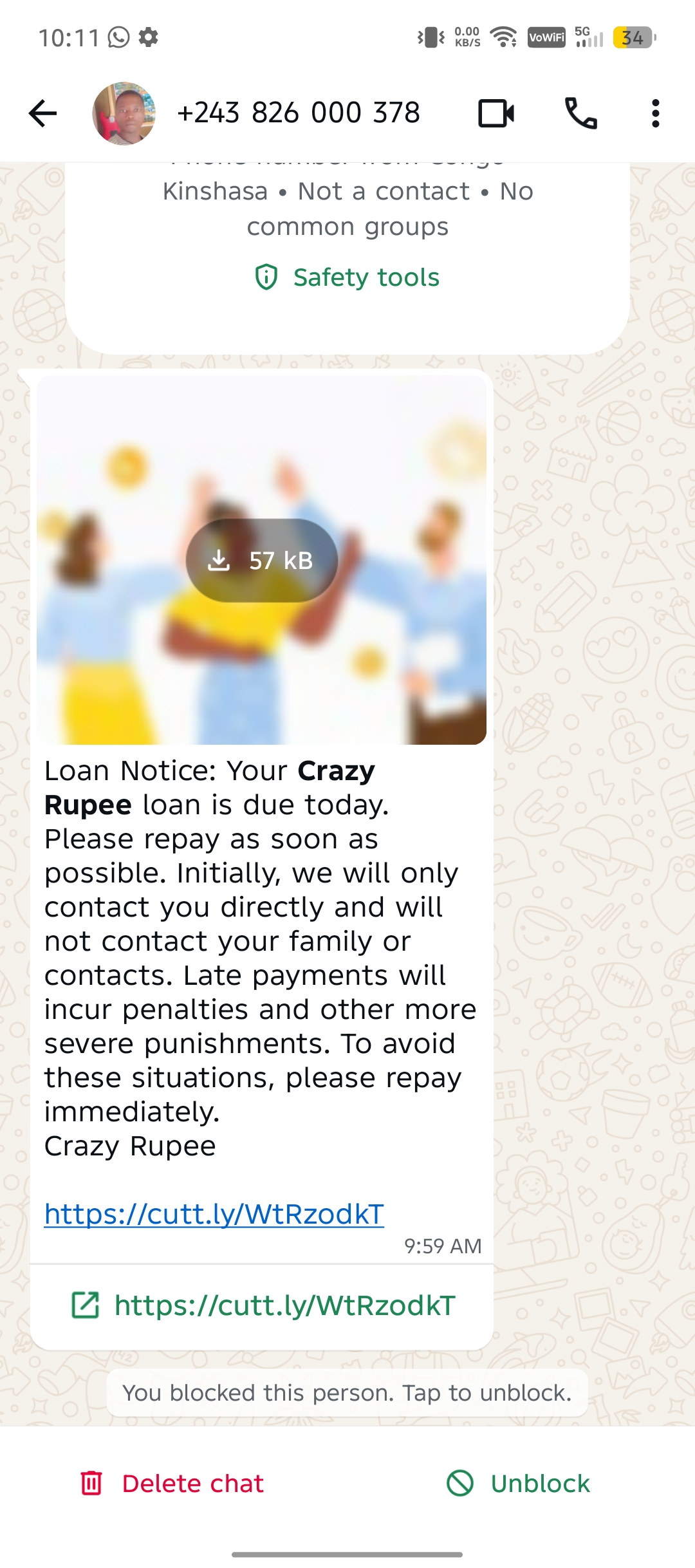 From a name of loan app “Crazy loan”, an agent sent whats app message asking for repayment of due amount, but I have not borrowed from the app.