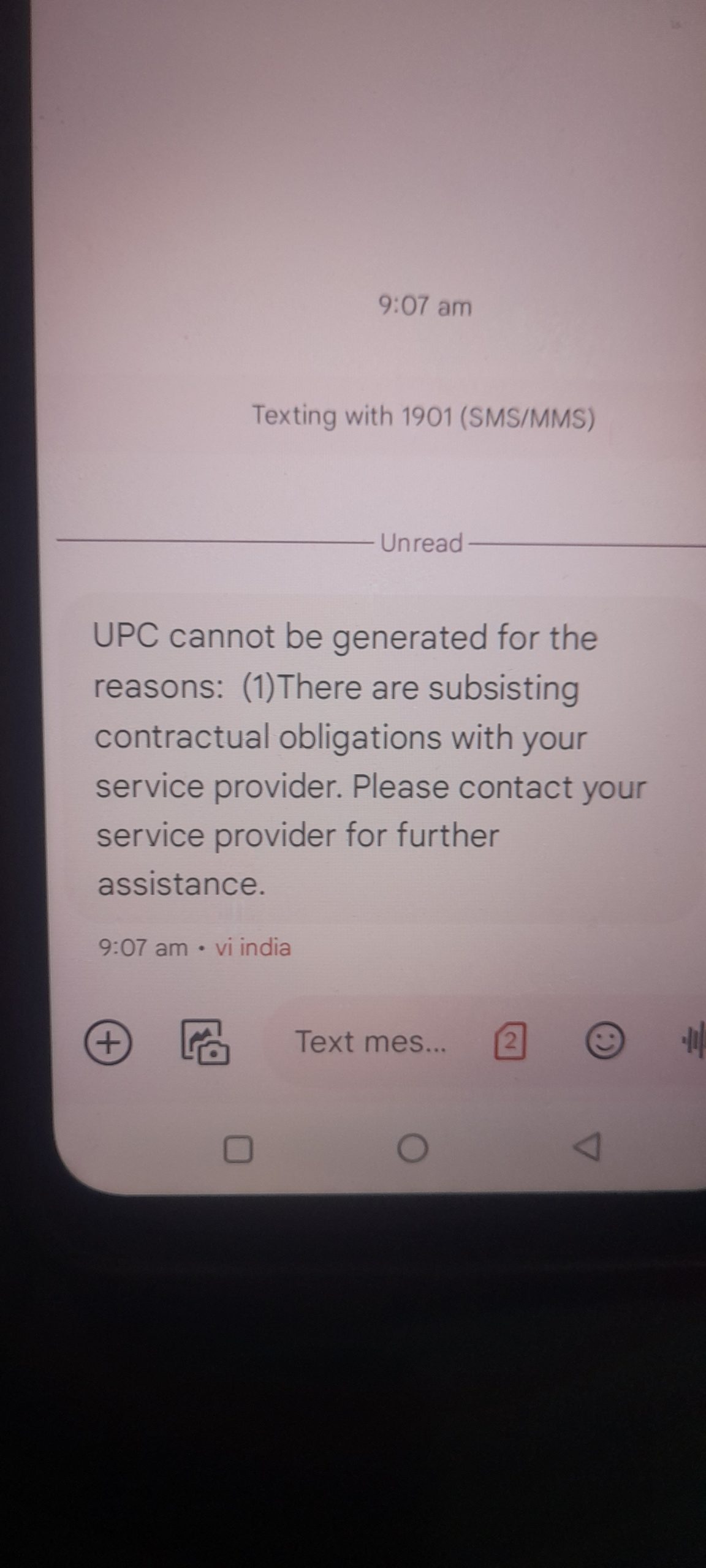 UPC cannot be generated for the reasons: (1)There are subsisting contractual obligations with your service provider. Please contact your service provider for further assistance.
