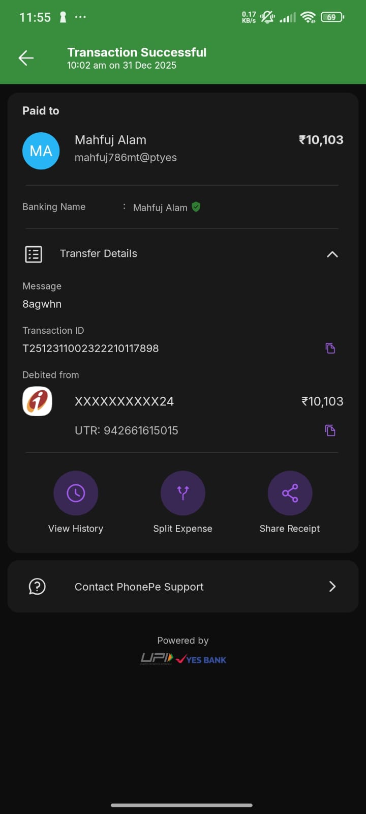 I MADE A MERCHANT PAYMENT ON 31 DEC OF AMOUNT 10103 TO mahfuj786mt@ptyes…but the merchant is denying the payment
