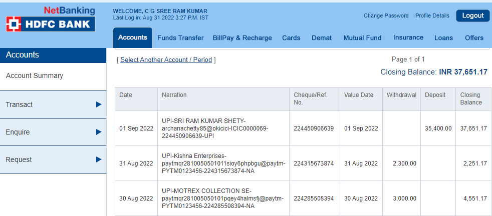 On 30.08.2022 I lost Rs. 3100.00 and 31/08/2022 i lost 2300.00 over a fraud transaction to MOTREX COLLECTION SERVICES and KRISHNA ENTERPRISES, I am following up from 1st September till date there is no solution has been provided by Paytm team, Infact i have given their UPI id’s to which the payment went, they are telling we cannot help you in this , kindly contact Police.
