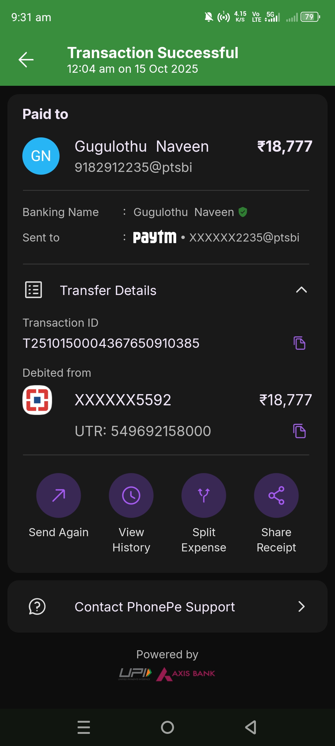 Paid to: Gugulothu Naveen — 9182912235@ptsbi