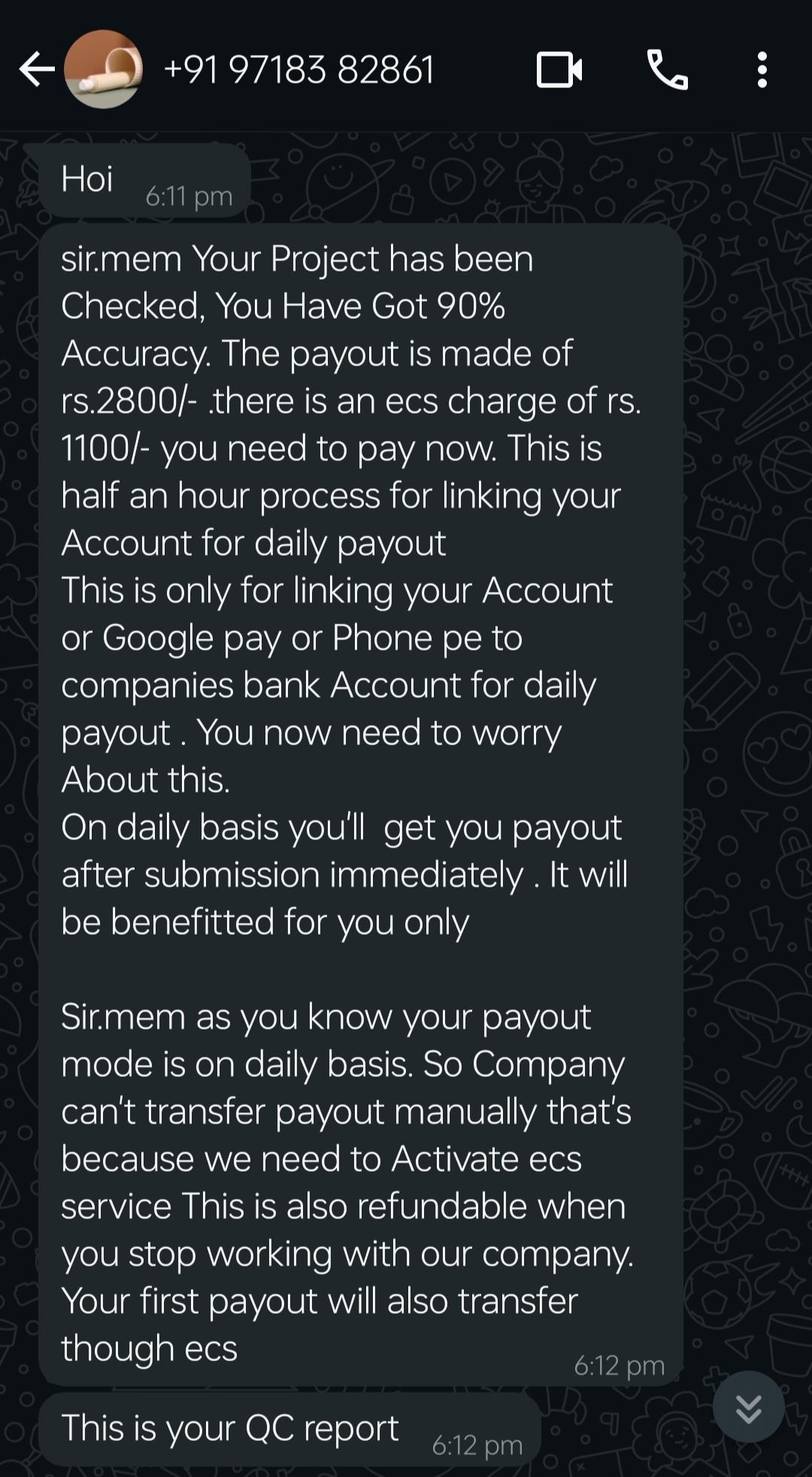 Later, they informed me that my work had 90% accuracy and mentioned an “ECS charge” of ₹2800, claiming it was refundable.