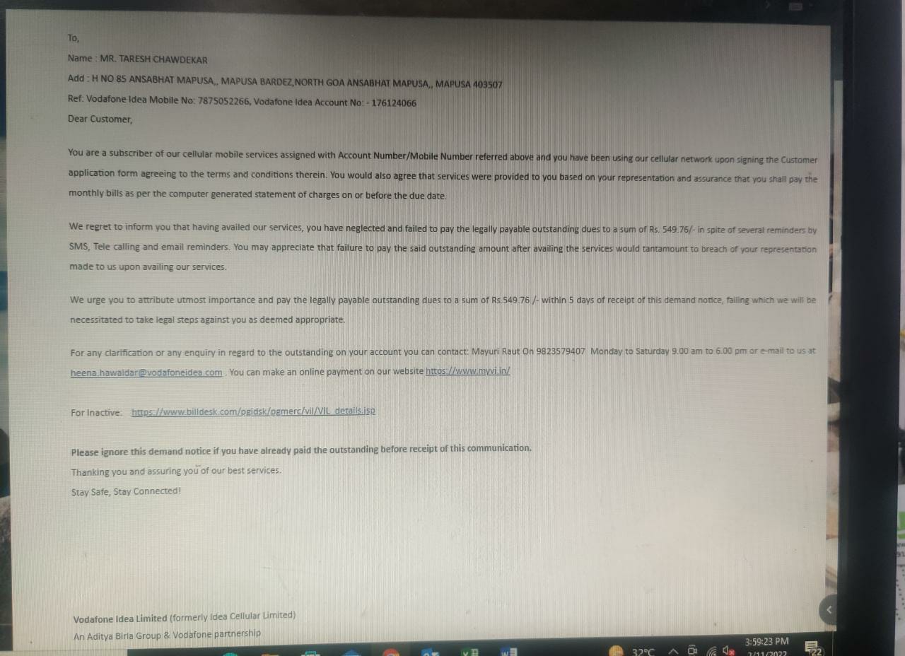 I was getting calls repeatedly from Vodafone asking to pay bill for a number which i never brought, initially they said it was on my name (Taresh Chawdekar Ref: Vodafone Idea Mobile No: 7875052266, Vodafone Idea Account No: – 176124066) after sending me legaly notice through mail, now i am getting calls that it is registered in Shivaraj’s Name and documents produced by him was mine, was trying to explain that lady Mayuri Raut (9823579407/9172459450) from Vodafone(I think she is from Some Agency in Kolhapur), she did not try to listen instead she blamed saying I am lying and visit the store and cut the call. tried calling her many times on both the numbers mentioned above she started disconnecting, tried calling from other Numbers she straight away said i am lying and disconnected the call.