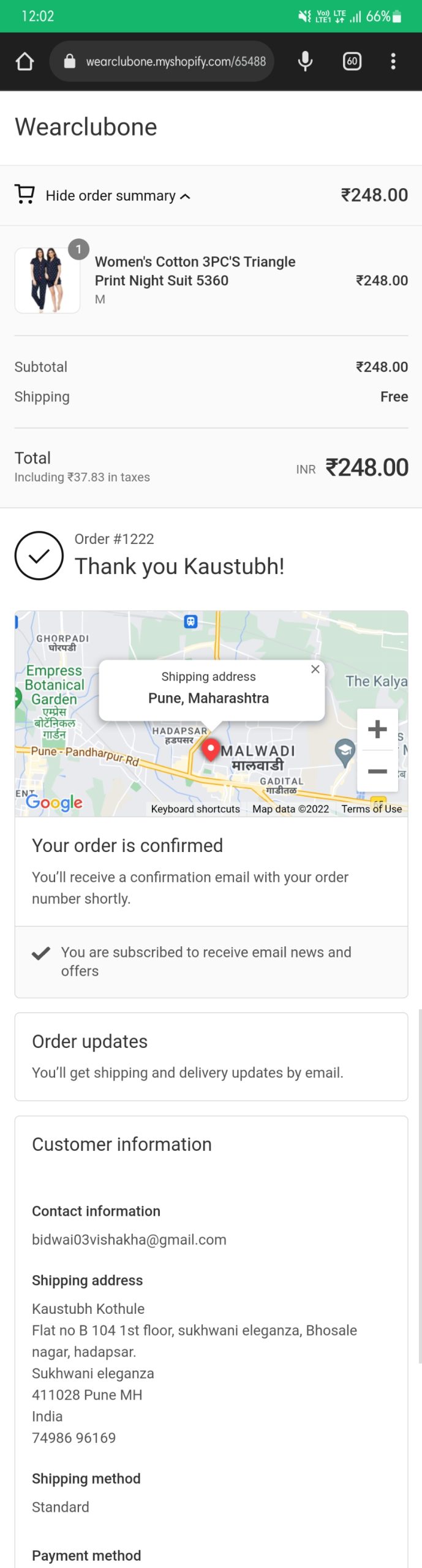 I ordered night suit on 20/07/22 with full paid amount of 248.00/- Rs. but still i didn’t received my ordered product . i am trying to reach customer care of wearclubone . but its failed. i want my money back in any condition. its a fraud site. dont purchase on this site at all.