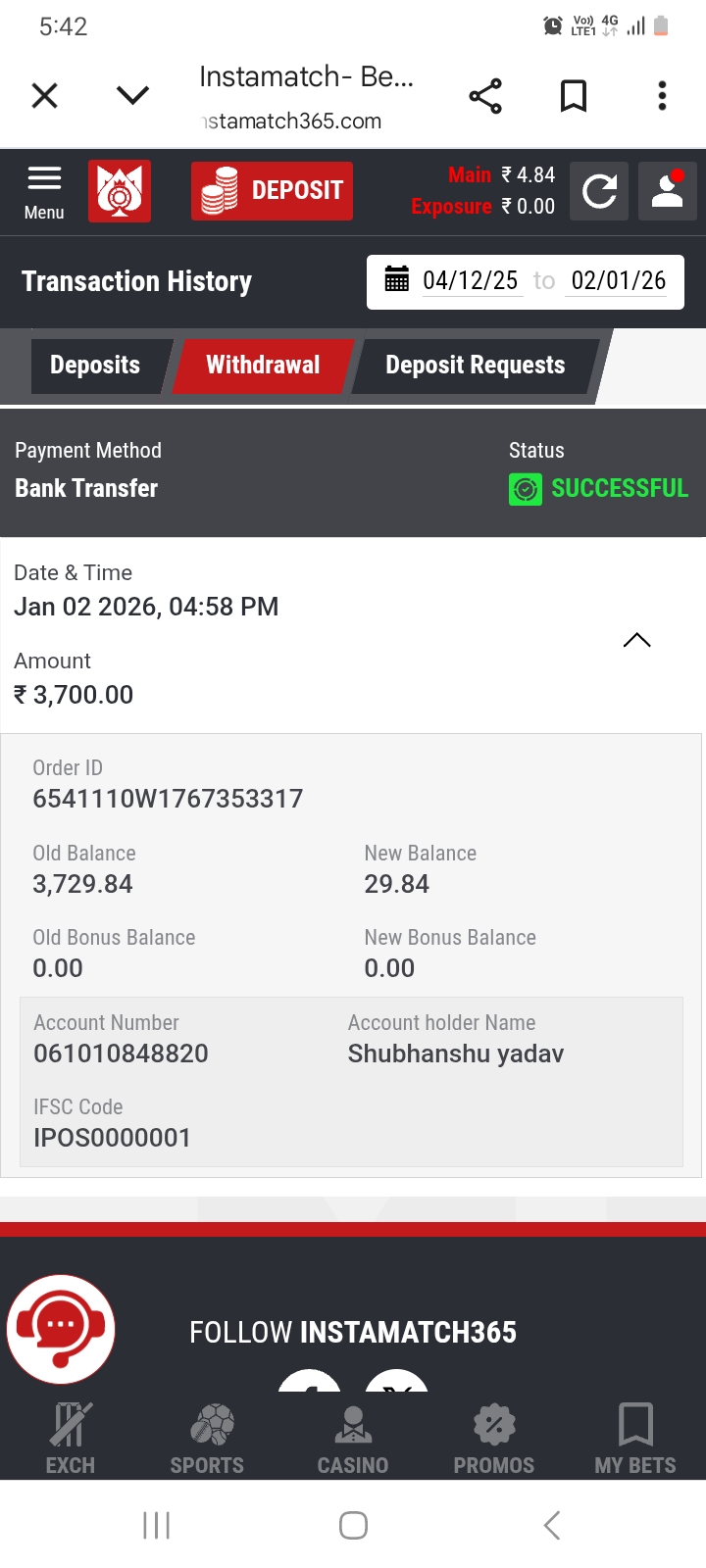 Sir, I deposited Rs 600 in the Winmatch account on 02/01/2026, after that I deposited Rs 3700 for withdrawal, it was showing successful in Winmatch but the amount was not received in the account, the Winmatch account has been blocked.