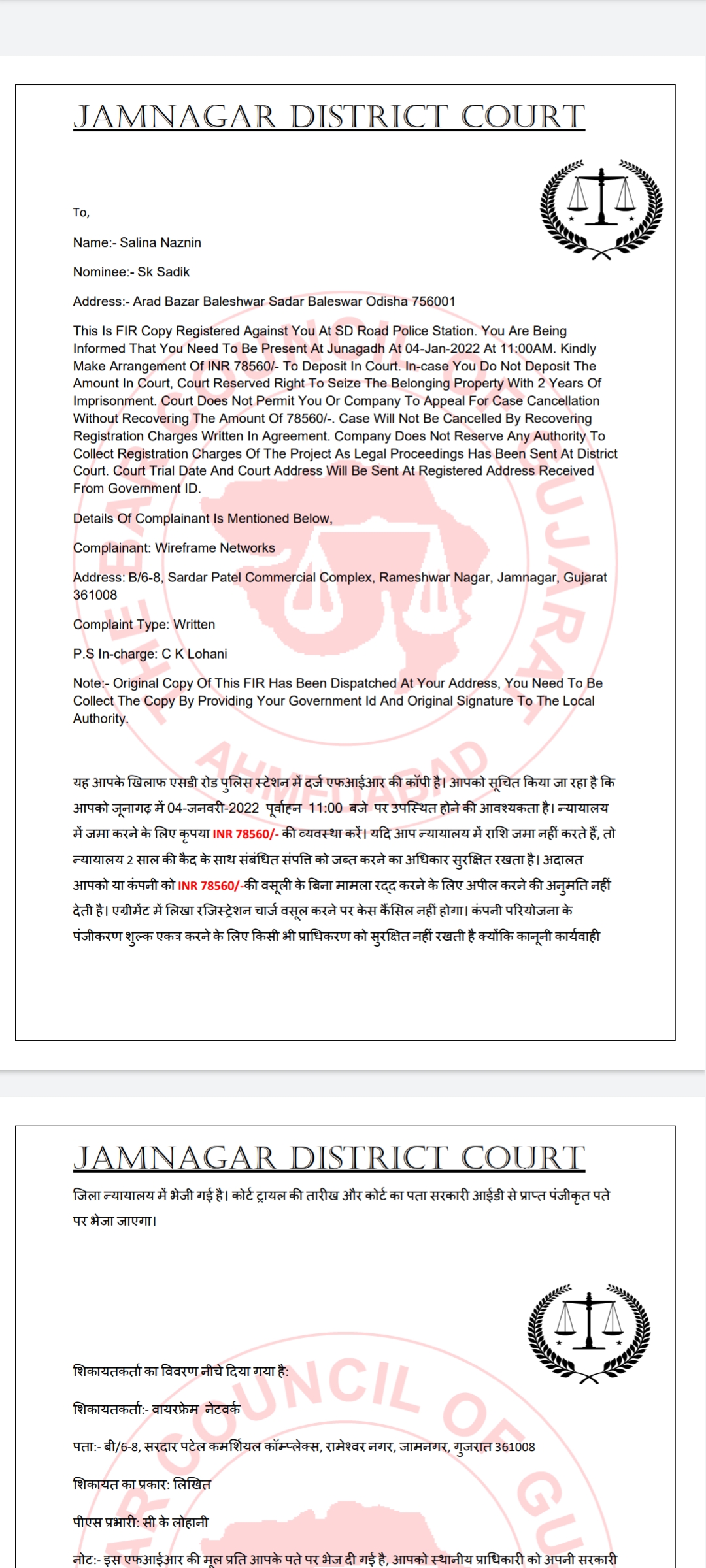 I have submitted my task on time and today on 31st Dec they have send me the report card saying that I haven’t met the required accuracy and asked me to give them Rs. 20,000. And after few minutes they sent me a F.I.R copy from Jamnagar District Court stating the following