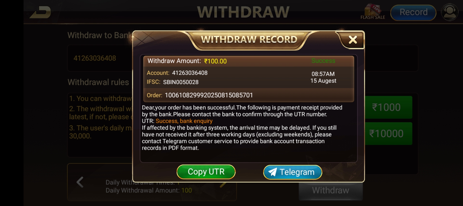 Hlo sir mainae 100 rupees ka withdraw Teen patti dhan aap pr but sir money successful honae Kae baad v marae account mai show nhi ho rha mai kya kru 10 times support services pr complaint ke pr ek nhi suni bs kindly send problem pic he aa rha hai. Sir plz marae paisae vapas dila do mai agae sae kbi paisae nhi lagaunga.