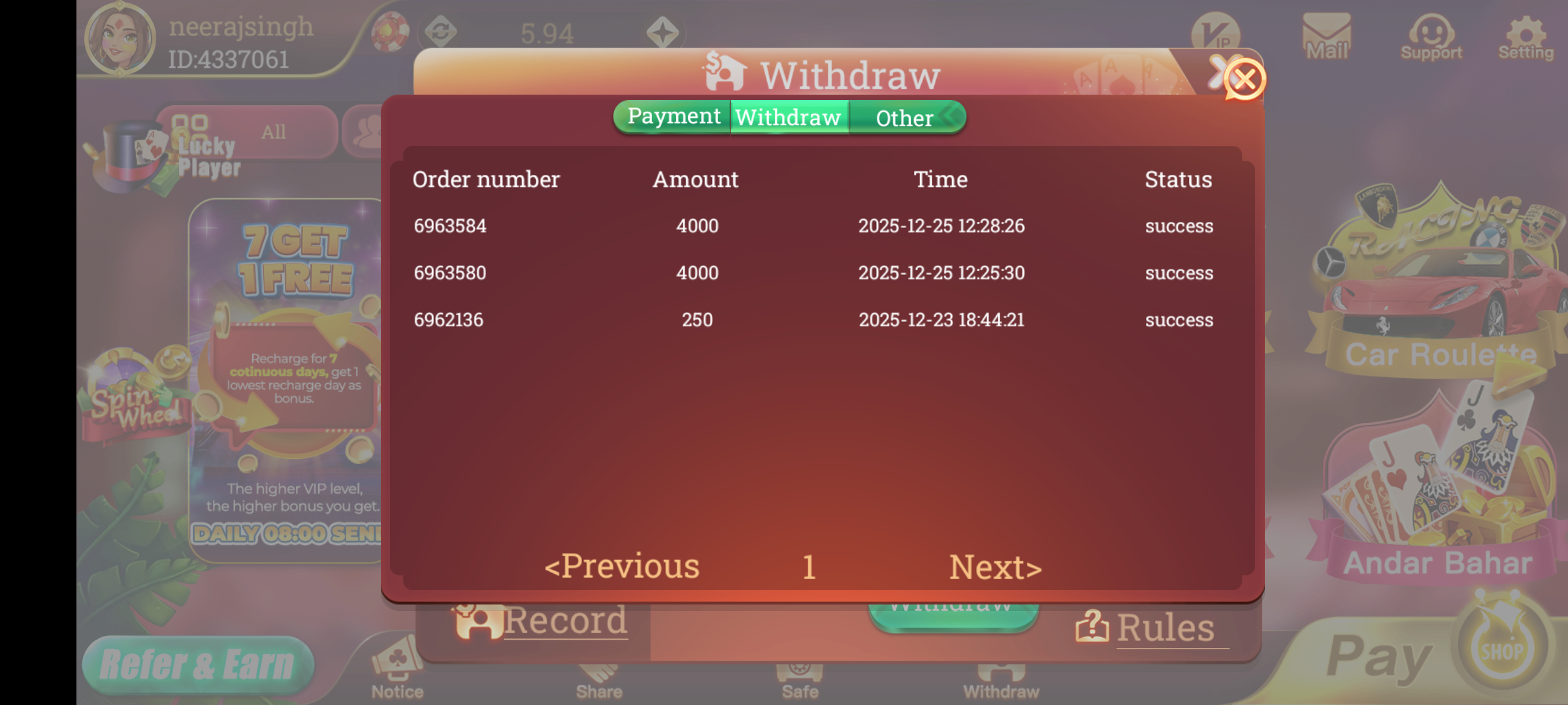 I make a withdrawal of rs 4000 on 25-12-2025 at 12:28 pm the order num of the withdrawal is 6963584 ,the amount got success in the game but not credited to my bank account