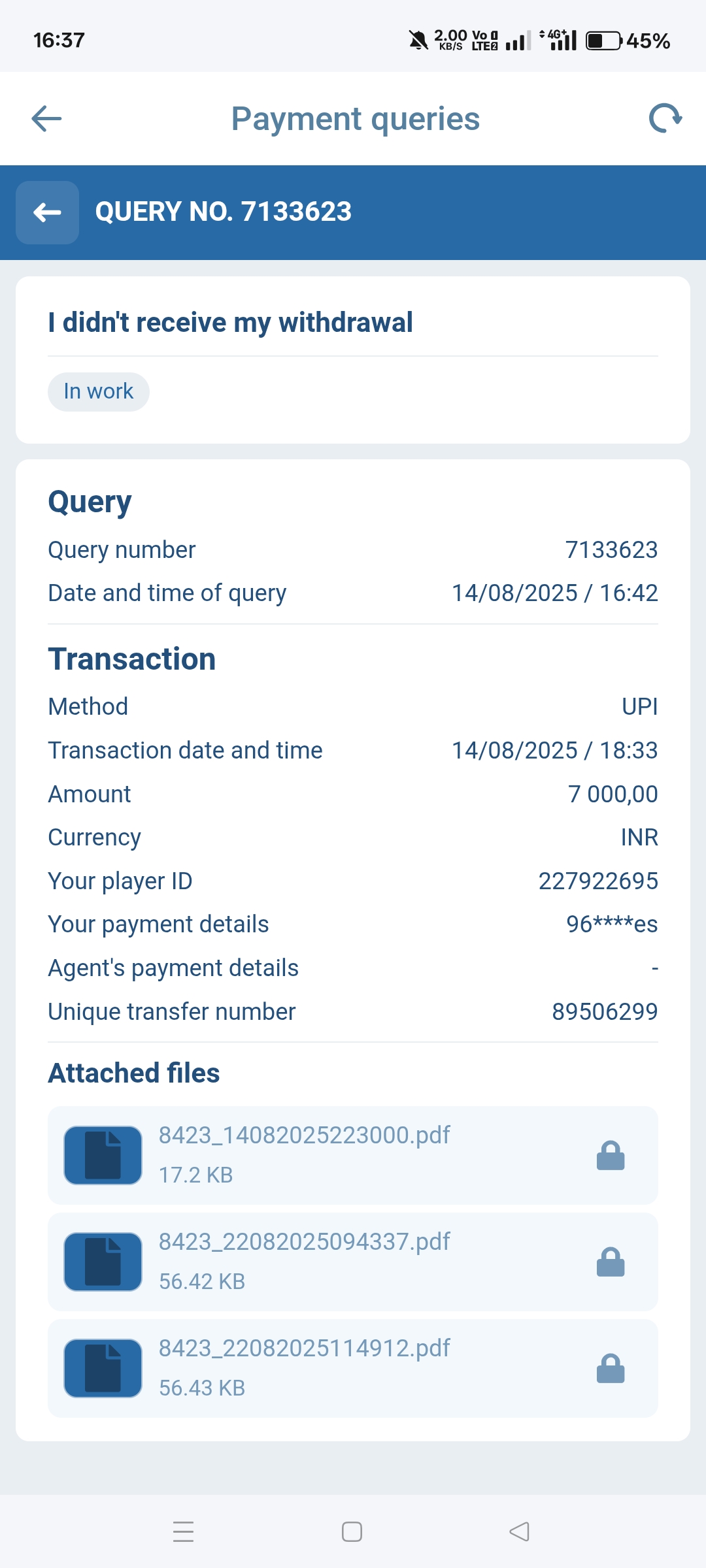 I made a withdrawal request Rs.7000 on 14/08/2025 from 1xbet but they haven’t sent the money and showing successful transaction. Now it’s 19 days passed still they are not giving my withdrawal money always told it’s processing.