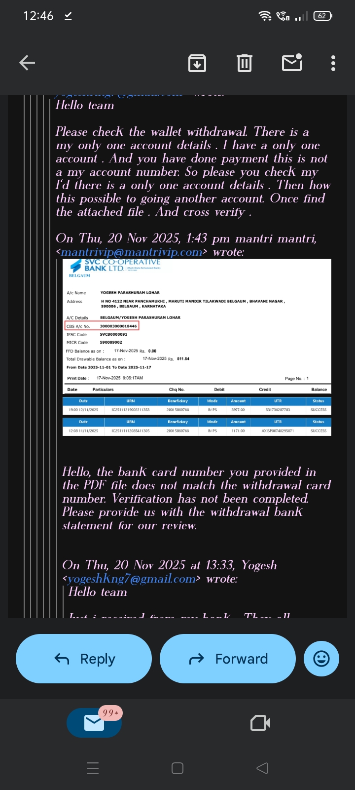 I was raised 2 withdrawal 1208/- on dated 11 November 2025 and 3977/- on dated 12 November 2025. After confirmation I have already checked my mantrivip wallet there is a my only one account. But mantrivip done on another account. They already shared me all screenshots. I have attached with the same . If possible then reverse me both transaction otherwise I will go on higher authority.