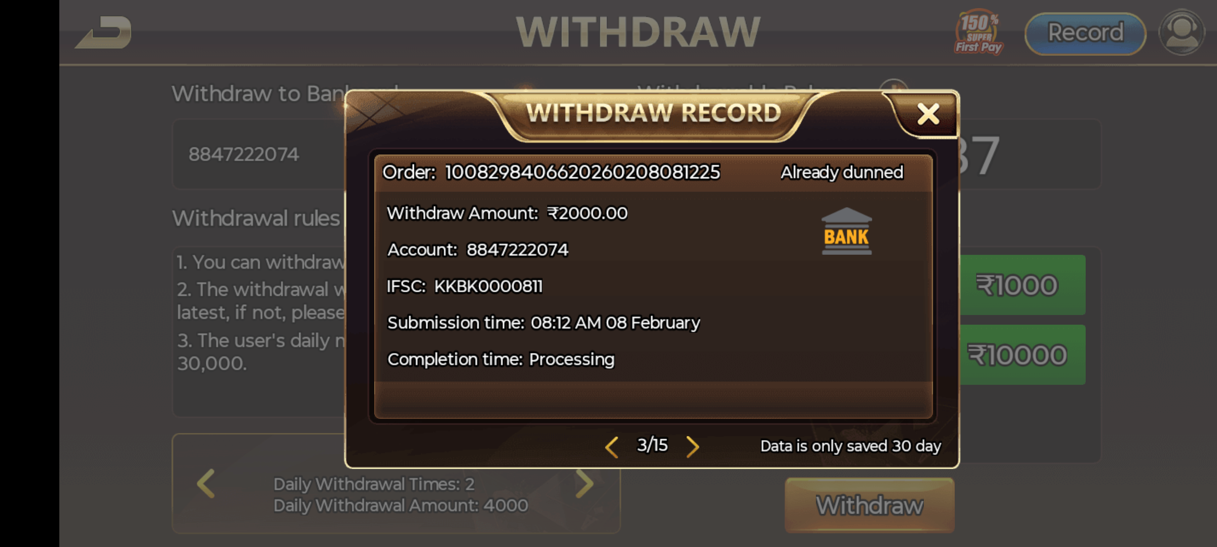 I withdraw amount of 2000 but not succes yet , still show processing and alredy dunned.