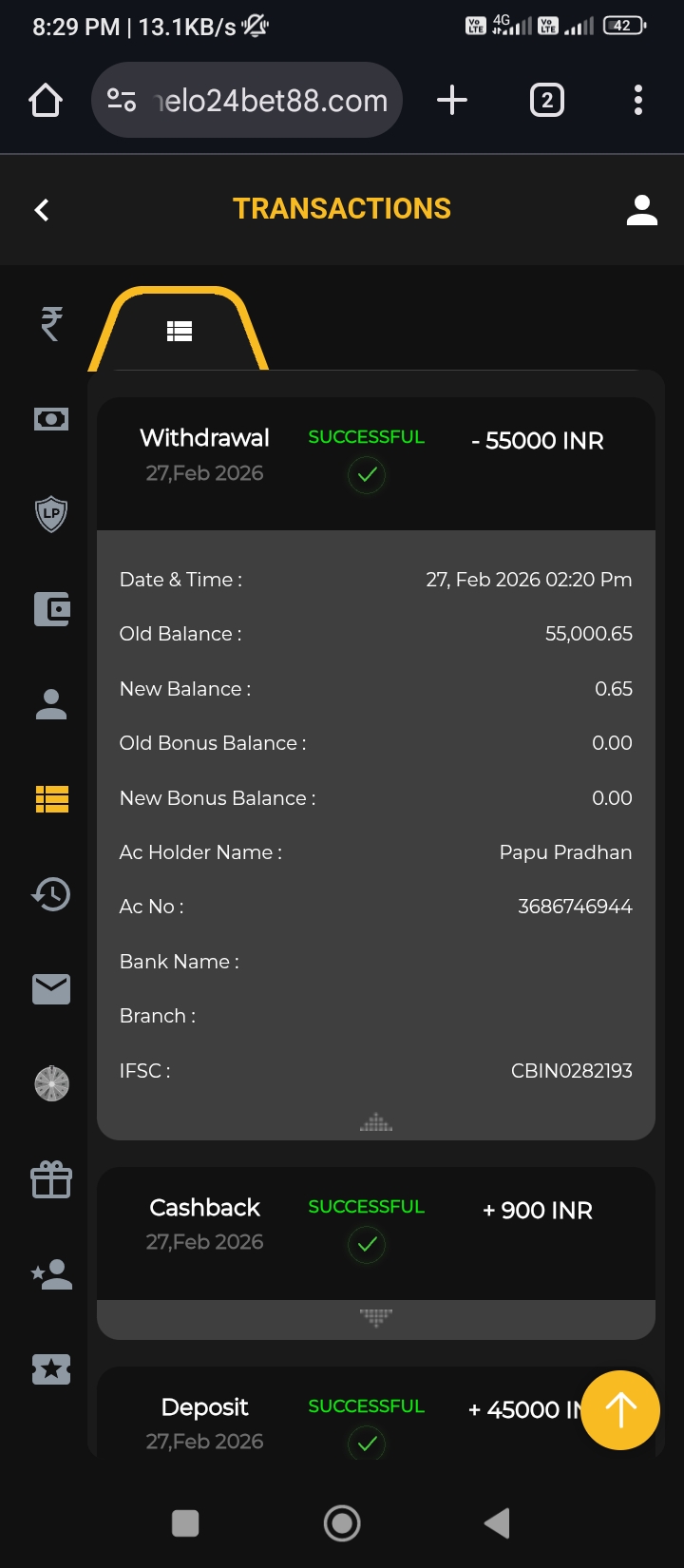 On February 27, 2026, at 2:20 PM, I initiated a withdrawal of 55,000 INR from the Khelo24bet platform to my bank account (Central Bank of India, A/C: 3686746944). The platform has marked the transaction as ‘SUCCESSFUL’ in their system, but the money has not reached my bank account. The platform is refusing to provide a 12-digit UTR (Unique Transaction Reference) number, which is required to track the funds. I suspect the funds are being intentionally withheld or the platform is engaging in fraudulent activities
