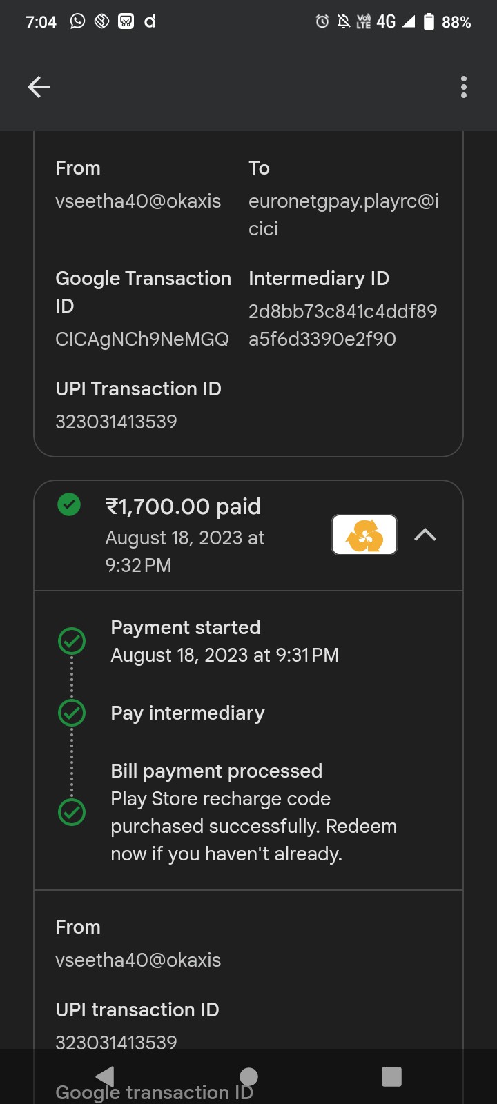 | Name(s) of companies complained against | Playstore recharge from euronetgpay.playrc@icici |